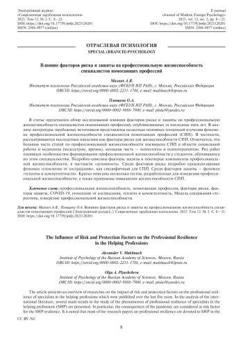 22. Glowacz F., Schmits E., Kinard A. The impact of the COVID-19 crisis on the practices and mental health of psychologists in Belgium: Between exhaustion and resilience // International Journal of Environmental Research and Public Health. 2022. Vol. 19. № 21. Article ID 14410. 19 p. DOI: 10.3390/ijerph192114410 EDN: NODBHM