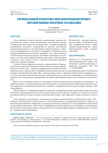 Статья посвящена анализу феномена «региональный культурно-образовательный проект». Автор рассматривает региональный культурно-образовательный проект как системное целое, в котором объединены разнообразные активности, направленные на развитие региональной культурной идентичности и способствующие самоактуализации и творческому самовыражению его участников, и утверждает, что бо́льшую отдачу культурно-образовательные проекты приобретут, если будут опираться на понимание региональной культуры, осознавая закономерности ее развития и на этой основе определяя векторы реализации. Социокультурная значимость такого проекта состоит в развитии позитивной культурной идентичности детей и молодежи.