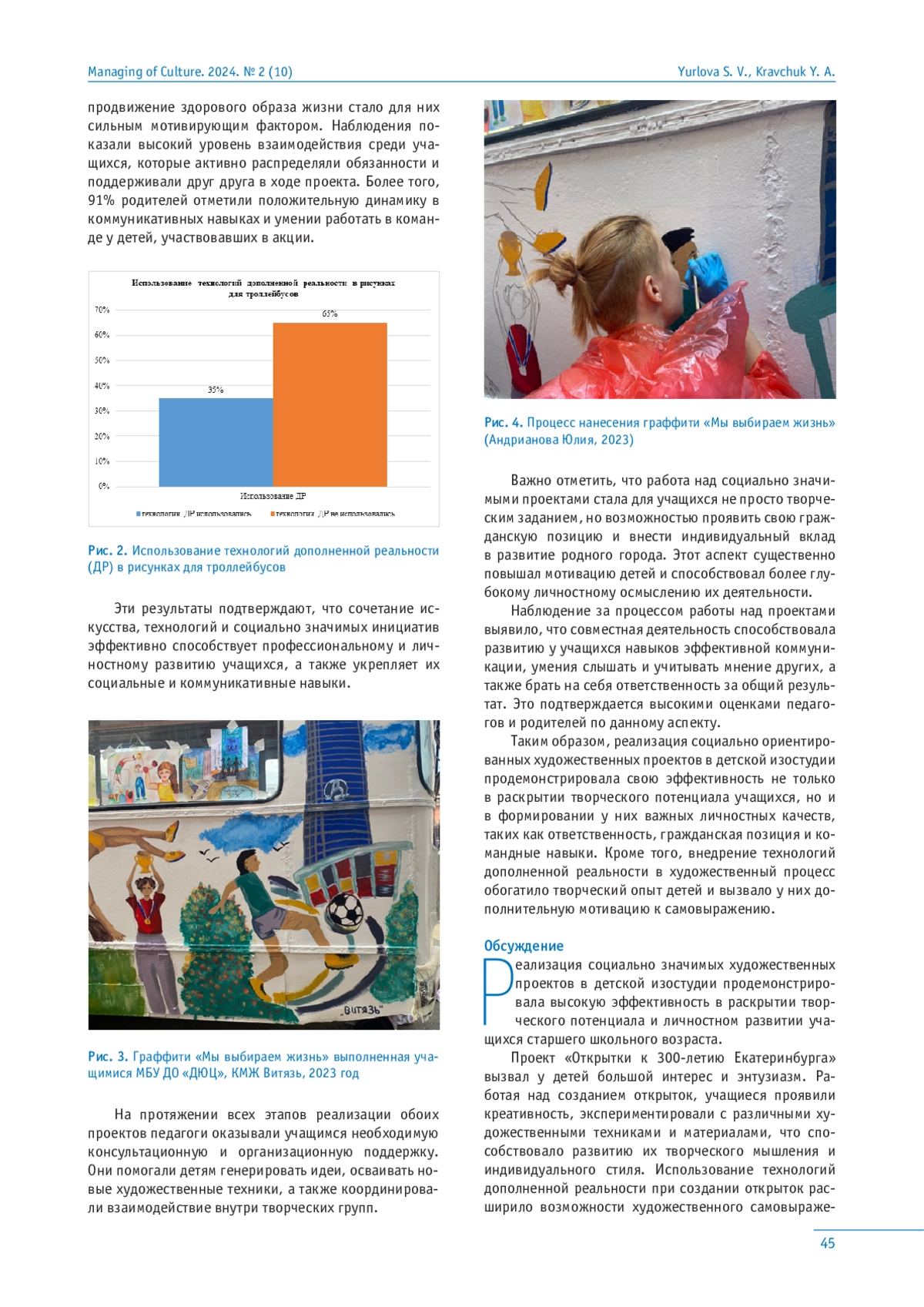 В современном обществе социально-ориентированные художественные проекты и использование технологий дополненной реальности играют значительную роль в творческом развитии старшеклассников и улучшении городской среды. В данной статье рассматриваются результаты двух основных проектов: «Открытки к 300-летию Екатеринбурга» и акции «Мы выбираем жизнь!», проведенных в детской изостудии. Методы исследования включали наблюдение, анализ результатов творческой деятельности, беседы с учащимися, анкетирование родителей и педагогов.