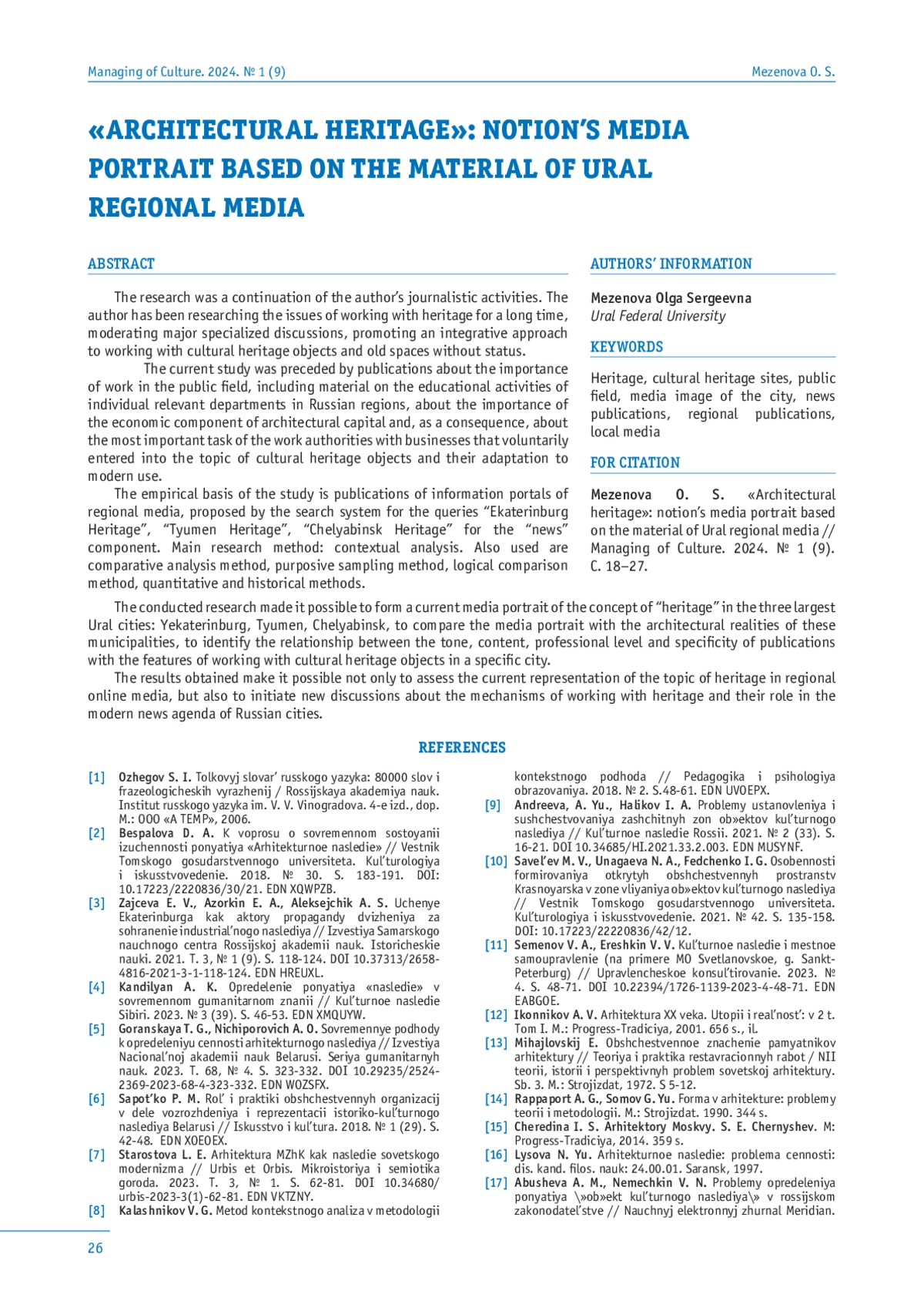 Цель исследования – выявить специфику описания архитектурного наследия крупных городов Урала (Екатеринбурга, Тюмени, Челябинска) в региональных СМИ. Задачи исследования – проанализировать контексты, в которых встречается понятие наследие, выявить основные оценочные маркеры, используемые авторами статей, посвященных изучаемому понятию, определить вербальные знаки, сигнализирующие о социальной значимости / важности / напряженности и пр. В исследовании предпринята попытка установить связь тематики публикаций с объективными реалиями рассматриваемых городов. Объект исследования – репрезентация понятия «архитектурное наследие» в материалах региональных СМИ Урала, предмет – контексты (или контекстное окружение), включающие данное понятие.