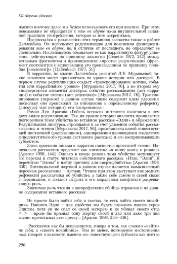 3. Муравьева Л.Е. Нарративная редупликация как фигура авторефлексии литературного дискурса: дис. к. филол. н.: 10.02.19. М., 2017. 233 c. EDN: ZQHPHT