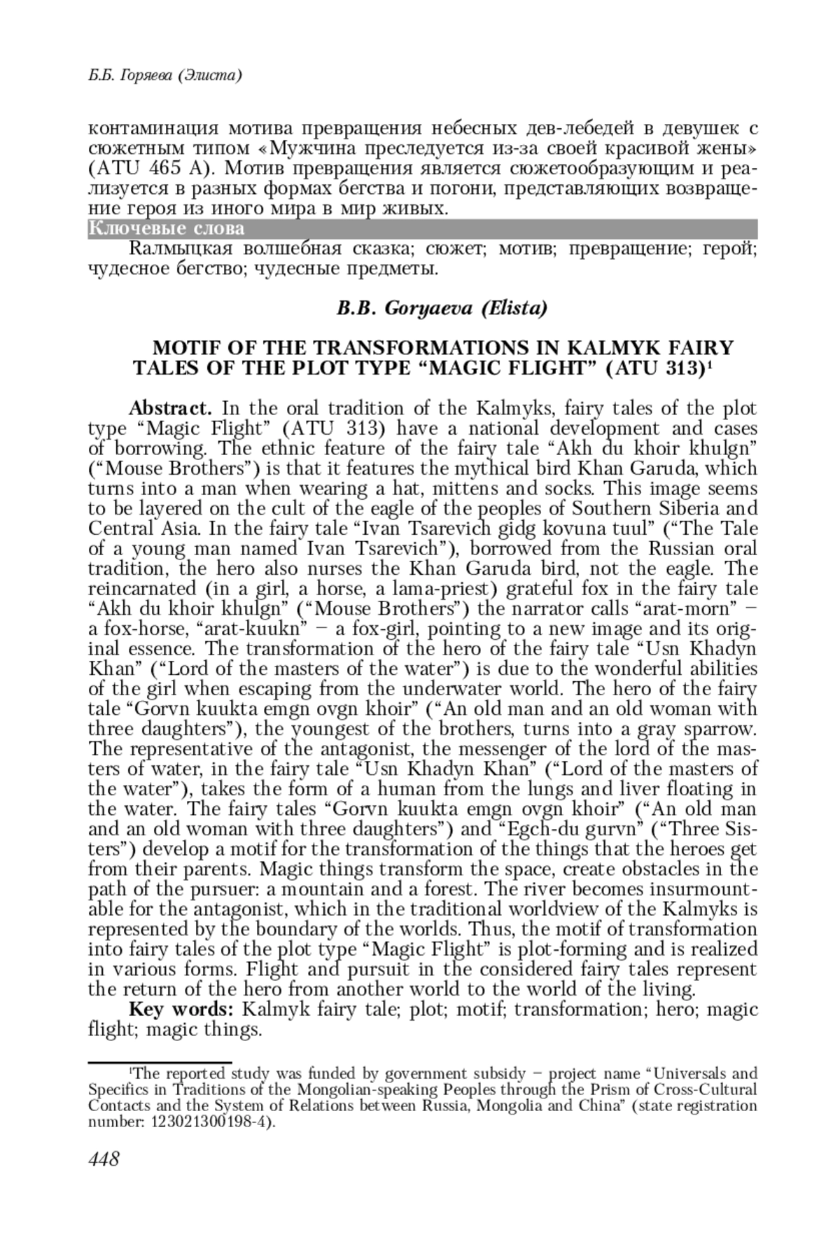 В устной традиции калмыков сказки на сюжетный тип «Чудесное бегство» (АТU 313) имеют национальную разработку и случаи заимствования. Этнической особенностью сказки «Ах дY хойр хулhн» («Братья-мыши») является то, что в ней мифическая птица хан Гаруда превращается в человека при надевании шапки, рукавиц и носков. Образ этот представляется наслоившимся на культ орла народов Южной Сибири и Центральной Азии, где исторически проживали предки калмыков - ой-раты. В сказке «Иван-царевич гидг кeвyнэ тууль» («Сказка о юноше по имени Иван-царевич»), заимствованной из русской устной традиции, герой также выхаживает птицу хан Гаруду, а не орла. Перевоплощенную (в девушку, соловую лошадь, ламу-священнослужителя) благодарную лису в сказке «Ах дy хойр хулhн» («Братья-мыши») называют «арат-мврн» -лиса-лошадь, «арат-куукн» - лиса-девушка, указывая на новый образ и ее изначальную сущность. Превращение героя сказки «Усн хадын хан» («Владыка хозяев воды») происходит благодаря чудесным способностям девушки при побеге из подводного мира. Герой сказки hорвн кyyктэ эмгн евгн хойр» («Старик и старуха с тремя дочерями»), младший из братьев, оборачивается в серого воробья (бор богшада). Представитель антагониста, посланец владыки хозяев воды, в сказке «Усн хадын хан» («Владыка хозяев воды») из легких и печени, плававших в воде, принимает облик человека. Сказки «hорвн кyyктэ эмгн евгн хойр» («Старик и старуха с тремя дочерями») и «Эгч-дy нтурвн» («Три сестры») разрабатывают мотив обращения предметов, которые достаются героям от их родителей. Чудесные вещи создают препятствия на пути преследователя: гору и лес. Непреодолимой для антагониста становится река, в традиционном мировоззрении калмыков представляющаяся границей миров. Следует отметить, что в калмыцких сказках используется универсальная контаминация мотива превращения небесных дев-лебедей в девушек с сюжетным типом «Мужчина преследуется из-за своей красивой жены» (ATU 465 А). Мотив превращения является сюжетообразующим и реализуется в разных формах бегства и погони, представляющих возвращение героя из иного мира в мир живых.