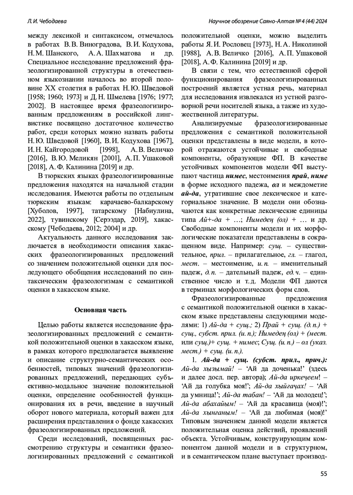 - Чебодаева Л. И. Синтаксические фразеологизмы с семантикой недифференцированной оценки в хакасском языке // Научное обозрение Саяно-Алтая. 2024. № 2 (42). С. 43–50.