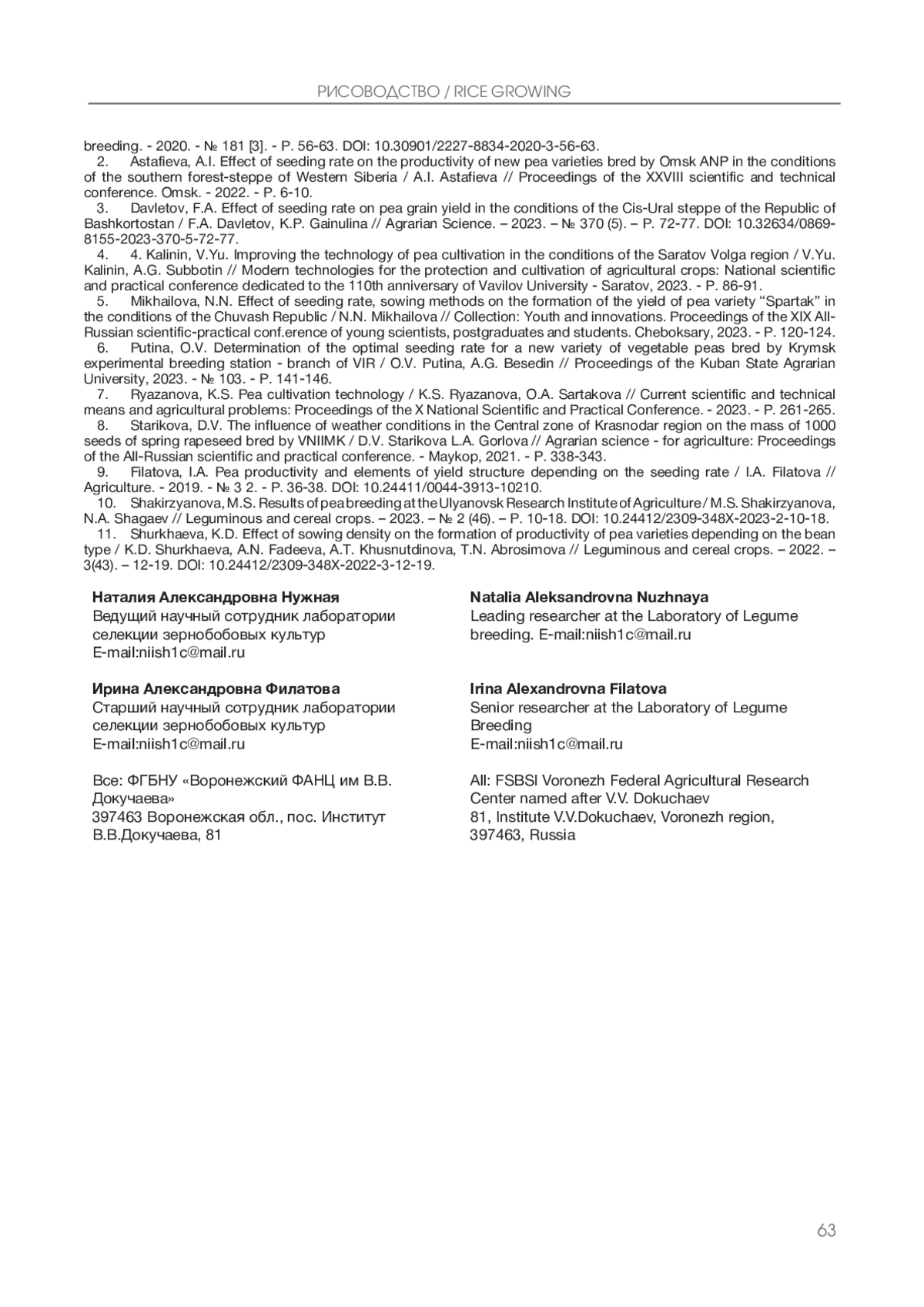 Целью проведенных исследований являлось изучение влияния густоты стеблестоя на высоту растения, высоту прикрепления нижнего боба, количество плодоносящих узлов, количество бобов, озерненность боба, количество зерен на растении, массу 1000 зерен, массу зерна с растения гороха. Для этого были подобраны наиболее популярные в производстве нормы высева 0,8; 1,0 и 1,3 млн всхожих семян на 1 га. Опыты проведены в 2019-2021 гг., они являются частью селекционно-семеноводческих исследований проводимых в ФГБНУ «Воронежский ФАНЦ им. В. В. Докучаева», расположенного на юго-востоке Центрально-Черноземного региона. Объектами исследования выступали сорта местной селекции разных лет создания Фокор (2005 г.), Докучаевский (2024 г.) и перспективные сортообразцы 61/18 и 61/14. Оценки и учеты проводили в соответствии с методикой Государственного сортоиспытания сельскохозяйственных культур. Было установлено, что увеличение нормы высева с 0,8 млн всхожих семян на 1 га до 1,3 млн всхожих семян на 1 га приводит к увеличению общей высоты растения и высоты прикрепления нижнего боба. При снижении нормы высева увеличиваются количественные показатели растения: количество плодоносящих узлов, бобов, зерен в бобе и на растении, но при этом снижается масса 1000 зерен. Значение показателя «масса зерна с растения» при разной норме высева меняется в зависимости от погодных условий в период вегетации. В неблагоприятные годы максимальная продуктивность растения формировалась при норме высева 1,0 млн всхожих семян на 1 га, а в оптимальных условиях при норме высева 0,8 млн всхожих семян на 1 га. Высокой семенной продуктивностью обладали сортообразцы нового поколения. Наибольшая масса зерна с растения была у линии 61/18 2,63 г/раст. Незначительно уступил ей новый сорт гороха Докучаевский -2,57 г/раст. Самая низкая масса зерна с растения была у сорта Фокор 2,28 г/раст.
