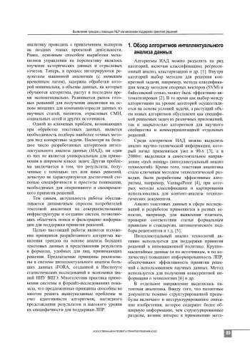 В статье изложены принципы разработанного алгоритма выявления трендов на основе анализа больших текстовых данных и представления результата в удобных для лиц принимающих решения (ЛПР) форматах, реализованных в системе интеллектуального анализа больших данных iFORA. Дается обзор существующих алгоритмов текстовой аналитики. Излагается предлагаемая и апробированная на десятках реализованных проектов математическая основа для выявления терминов, означающих тренды. Описываются подходы к кластеризации терминов на основе их векторов в пространстве Word2vec. Приводятся примеры двух ключевых визуализаций (семантические, тренд-карты), дающих представление о круге тем и трендах, характеризующих конкретную исследуемую область, как способ адаптации результатов анализа к задачам ЛПР. Обсуждаются ограничения и преимущества использования предложенного подхода для поддержки принятия решений, предлагаются направления для будущих исследований.