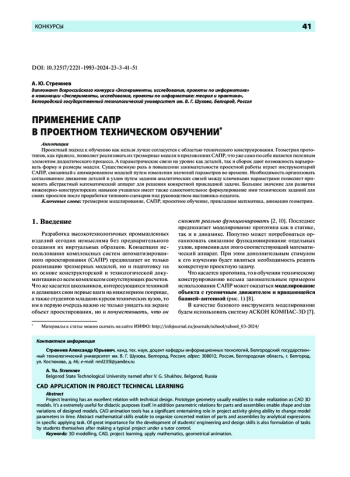 1. Афонина Е. В., Басс Н. В. Анимация проектируемого объекта в КОМПАС-3D на занятиях по инженерной графике // Автоматизация и моделирование в проектировании и управлении. Сборник научных статей Всероссийской конференции (Брянск, 19 мая 2021 года). Брянск: Брянский государственный технический университет, 2021. С. 197–200. EDN: MOGDOV.