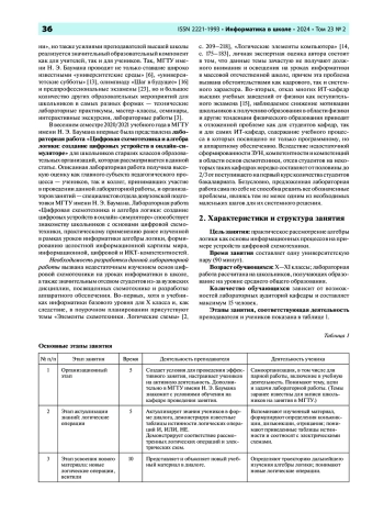 Аннотация В статье представлена и подробно описана лабораторная работа «Цифровая схемотехника и алгебра логики: создание цифровых устройств в онлайн-симуляторе», проводимая для старших школьников в МГТУ имени Н. Э. Баумана. Во введении показано место занятия в системе взаимодействия организаций среднего общего и высшего уровней образования, на основе рассмотренных проблем образования в области цифровой схемотехники приведено обоснование необходимости данной лабораторной работы. Практико-ориентированный характер рассмотренной лабораторной работы по информатике обуславливает необходимость применения современных средств моделирования. В данной лабораторной работе используется онлайн-среда Logic. ly, позволяющая создавать и исследовать цифровые устройства: полусумматор, сумматор, триггеры, мультиплексоры, дешифраторы. Подробно описаны основные характеристики, структура и ход занятия, предметное содержание и межпредметные связи, целевые предметные и метапредметные результаты на основе современного компетентностного подхода.