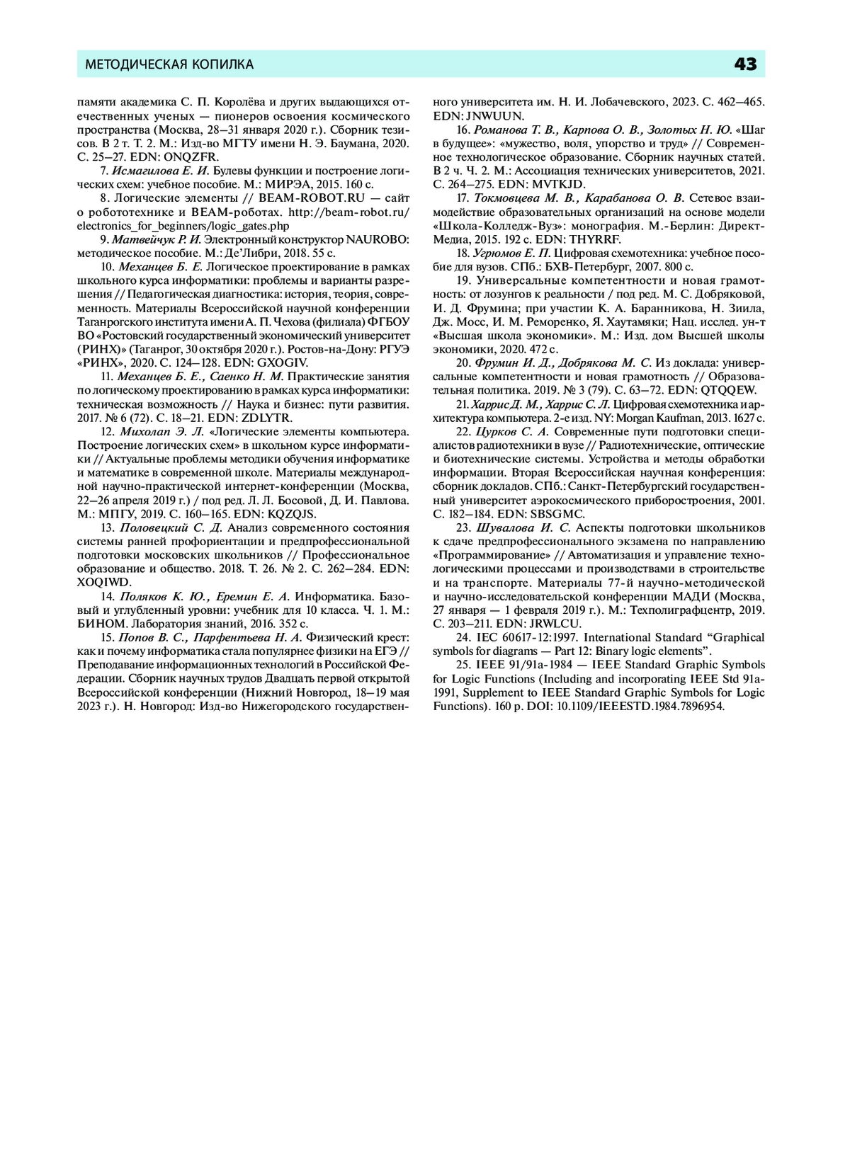 12. Михолап Э. Л. «Логические элементы компьютера. Построение логических схем» в школьном курсе информатики // Актуальные проблемы методики обучения информатике и математике в современной школе. Материалы международной научно-практической интернет-конференции (Москва, 22–26 апреля 2019 г.) / под ред. Л. Л. Босовой, Д. И. Павлова. М.: МПГУ, 2019. С. 160–165. EDN: KQZQJS.