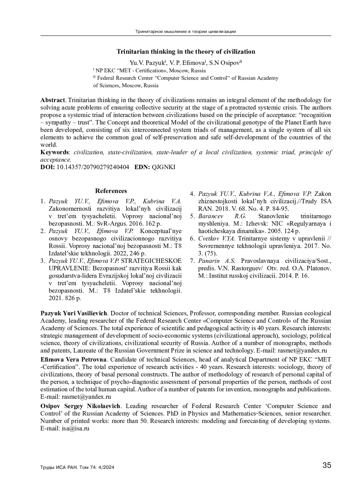 ПАЗЮК Ю. В., ОСИПОВ С. Н., ЕФИМОВА В. П. ТРИНИТАРНОЕ МЫШЛЕНИЕ В ТЕОРИИ ЦИВИЛИЗАЦИИ // ТРУДЫ ИНСТИТУТА СИСТЕМНОГО АНАЛИЗА РОССИЙСКОЙ АКАДЕМИИ НАУК. 2024. ТОМ 74, № 4