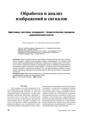Свет, попадая на сетчатку человеческого глаза, воспринимается как имеющий тот или иной цвет. Экспериментально показано, что даже свет совершенно разного спектрального состава может вызывать идентичные зрительные ощущения, то есть иметь один и тот же цвет. Это явление называется метамерией. Таким образом, пространство всевозможных цветов, видимых человеком, (цветовое пространство) можно рассматривать как фактор-пространство над пространством излучений всевозможных спектральных составов. Экспериментальные исследования, начатые Грассманом, показывают, что цветовое пространство человека представляет собой конус в трехмерном векторном пространстве [1]. Среди различных систем координат, которые могут быть введены в цветовом пространстве (цветовых координат), особое место занимают равноконтрастные. Равноконтрастные системы цветовых координат (РСЦК) моделируют различение цветов человеком так, чтобы евклидово расстояние между парами точек (цветов) было пропорционально воспринимаемой человеком величине различия между этими цветами.