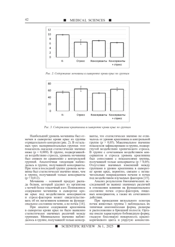 Цель исследования – изучить сочетанное влияние пищевых консервантов и стресс-факторов на морфофункциональное состояние почек. Исследование проведено в течение 28 дней на 24 белых аутбредных крысах-самцах весом 190–210 г. Животные были разделены на 4 группы по 6 особей: группа отрицательного контроля (К-); группа, где животных подвергали воздействию стресс-факторов (Стресс); группа животных, получавшая консерванты (Консерванты); комбинированная группа с воздействием стресс-факторов и консервантов (Консерванты + стресс). Группам 1 и 2 вводили дистиллированную воду, группам 3 и 4 вводили сорбиновую (500 мг/кг) и бензойную (100 мг/кг) кислоты. В конце эксперимента проведены биохимические и морфологические исследования. В результате проведенных исследований установлено повышенное содержание мочевой кислоты в сыворотке крови крыс под воздействием стресс-факторов и консервантов, которое может быть связано с негативным воздействием на функции почек. Пониженное содержание мочевины в сыворотке крови крыс под воздействием изучаемых факторов может свидетельствовать об их негативном влиянии на функциональное состояние печени. Полученные результаты свидетельствуют об отсутствии значимых изменений между группами в уровне креатинина. По итогу биохимических и гистологических исследований выявлено, что длительное воздействие стресса и консервантов оказывает влияние на биохимические показатели сыворотки крови, но не вызывает значительных структурных изменений в почках. Таким образом, изолированное и сочетанное воздействие пищевых консервантов и стрессовых факторов на почки крыс не оказывает существенного влияния на функциональное состояние почек и не вызывает видимых структурных изменений в их тканях. Для уточнения полученных результатов необходимо продолжение исследований на более длительных сроках воздействия при разных уровнях доз.