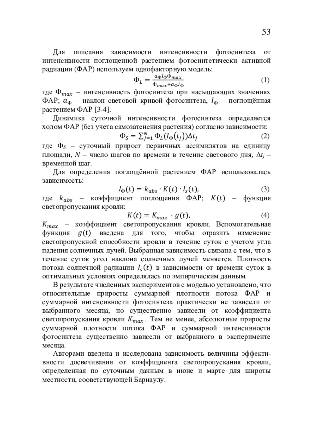Среди основных внешних факторов, влияющих на интенсивность процесса фотосинтеза, главными являются освещение, тепловой и водный режим, атмосферная концентрация углекислого газа и кислорода, а также режим минерального питания. От сочетания этих условий, как следствие, зависят питание растений, их рост, развитие и урожайность [1-3]. Условия освещенности растений в сооружениях защищенного грунта зависят от многих факторов, в частности от угла наклона кровли, качества стекла или пленки на кровле. От интенсивности освещения зависят сроки плодоношения и нарастания урожая (весной и летом растения растут быстрее, чем зимой). Считается, что солнечный свет является лучшим освещением, поскольку филогенетическое развитие растений происходило именно на нем, растения лучше к нему приспособлены [1-2]. Рассмотрим ситуацию: растения выращиваются в теплице и создаются подходящие условия по всем метеофакторам для того, чтобы организовать наиболее благоприятную среду для роста и развития растения. Тем не менее, будем оптимизировать этот режим путем досвечивания. Например, в зимние месяцы можно будет в теплице организовать освещение, соответствующее летним месяцам. Либо в пасмурные дни досвечивать растения до режима непасмурного дня.