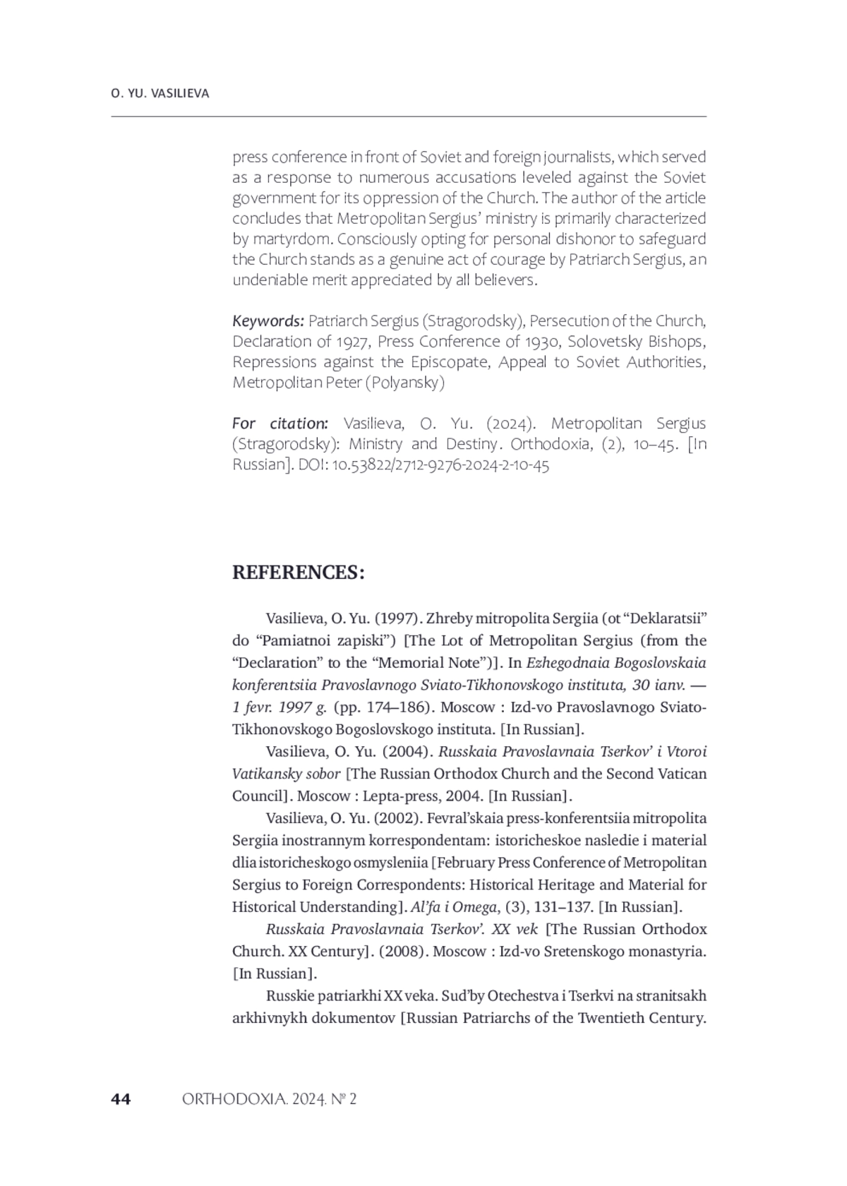 - Васильева О. Ю. Февральская пресс-конференция митрополита Сергия иностранным корреспондентам: историческое наследие и материал для исторического осмысления // Альфа и О мега. — 2002. — № 3. — С. 131–137.