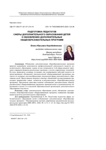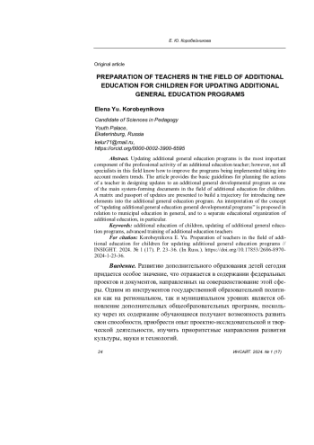 20. Коробейникова Е. Ю. Современные подходы к обновлению дополнительных общеобразовательных общеразвивающих программ: программа повышения квалификации. Екатеринбург, 2023. 13 с. URL: https://rmc.dm-centre.ru/wp-content/uploads/2023/11/DPP-PK-Sovremennye- podhody-k-obnovleniyu-DOOp-1-2.pdf.
