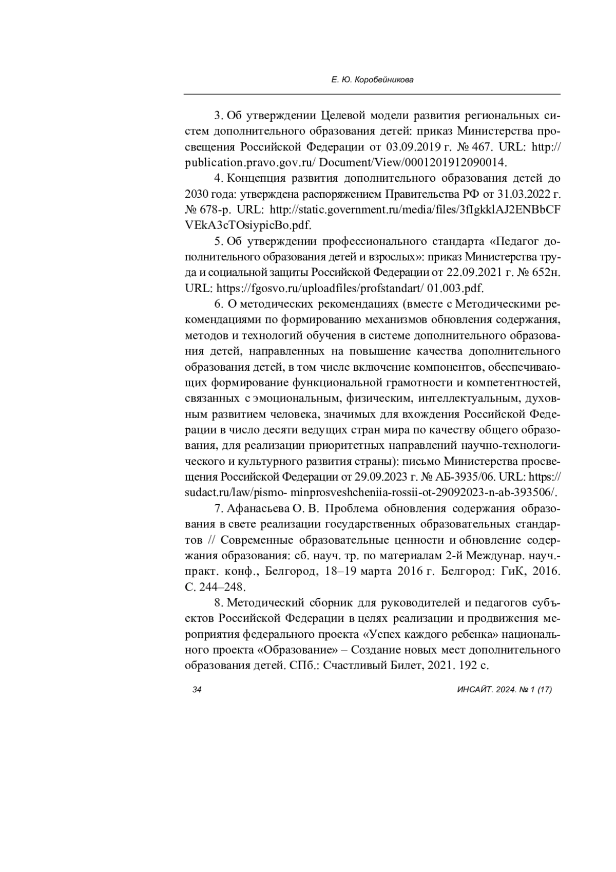 6. О методических рекомендациях (вместе с Методическими рекомендациями по формированию механизмов обновления содержания, методов и технологий обучения в системе дополнительного образования детей, направленных на повышение качества дополнительного образования детей, в том числе включение компонентов, обеспечивающих формирование функциональной грамотности и компетентностей, связанных с эмоциональным, физическим, интеллектуальным, духовным развитием человека, значимых для вхождения Российской Федерации в число десяти ведущих стран мира по качеству общего образования, для реализации приоритетных направлений научно-технологического и культурного развития страны): письмо Министерства просвещения Российской Федерации от 29.09.2023 г. № АБ-3935/06. URL: https://sudact.ru/law/pismo-minprosveshcheniia-rossii-ot-29092023-n-ab-393506/. 7. Афанасьева О. В. Проблема обновления содержания образования в свете реализации государственных образовательных стандартов // Современные образовательные ценности и обновление содержания образования: сб. науч. тр. по материалам 2-й Междунар. науч.- практ. конф., Белгород, 18-19 марта 2016 г. Белгород: ГиК, 2016. С. 244-248. EDN: ZINFDZ