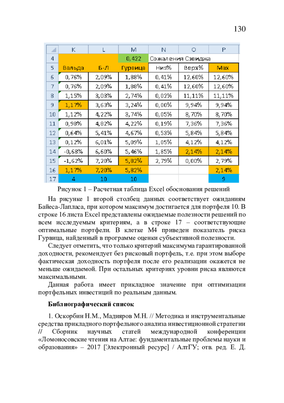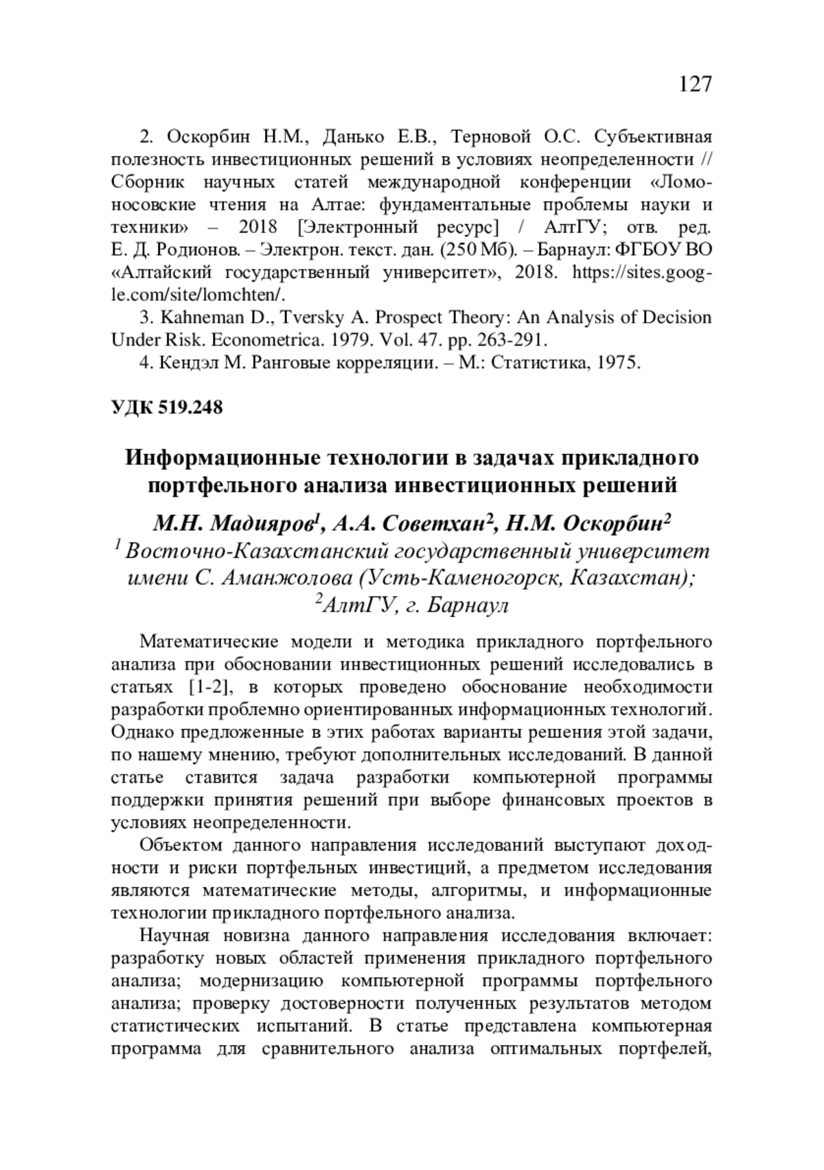 1. Оскорбин Н.М., Мадияров М.Н. // Методика и инструментальные средства прикладного портфельного анализа инвестиционной стратегии // Сборник научных статей международной конференции “Ломоносовские чтения на Алтае: фундаментальные проблемы науки и образования” - 2017 [Электронный ресурс] / АлтГУ; отв. ред. Е. Д. Родионов. - Электрон. текст. дан. - Барнаул: ФГБОУ ВО “Алтайский государственный университет”, 2017. - С. 622-623.