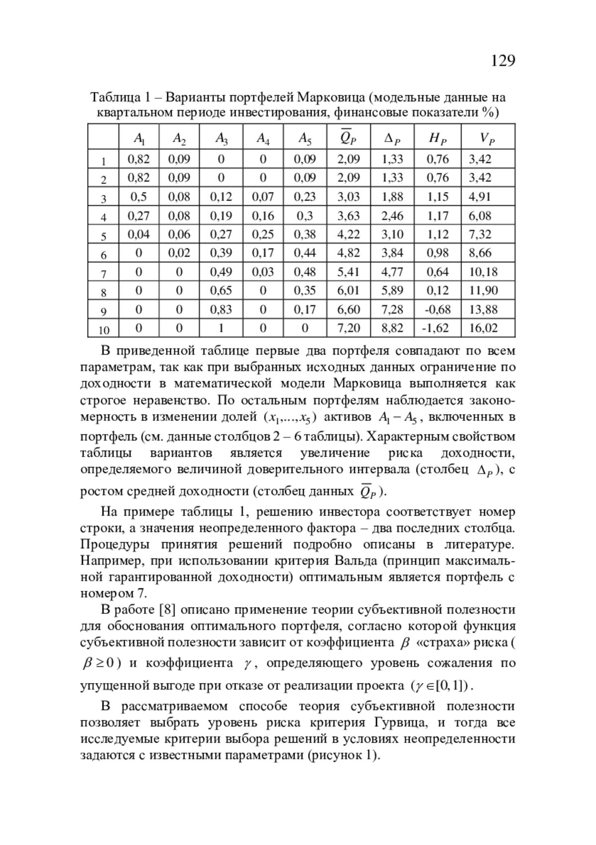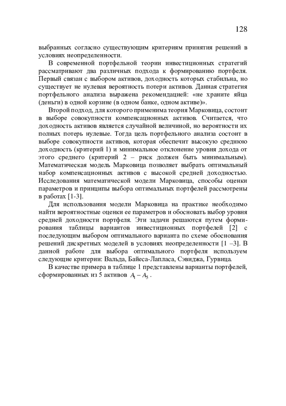 Второй подход, для которого применима теория Марковица, состоит в выборе совокупности компенсационных активов. Считается, что доходность активов является случайной величиной, но вероятности их полных потерь нулевые. Тогда цель портфельного анализа состоит в выборе совокупности активов, которая обеспечит высокую среднюю доходность (критерий 1) и минимальное отклонение уровня дохода от этого среднего (критерий 2 – риск должен быть минимальным). Математическая модель Марковица позволяет выбрать оптимальный набор компенсационных активов с высокой средней доходностью. Исследования математической модели Марковица, способы оценки параметров и принципы выбора оптимальных портфелей рассмотрены в работах [1-3].