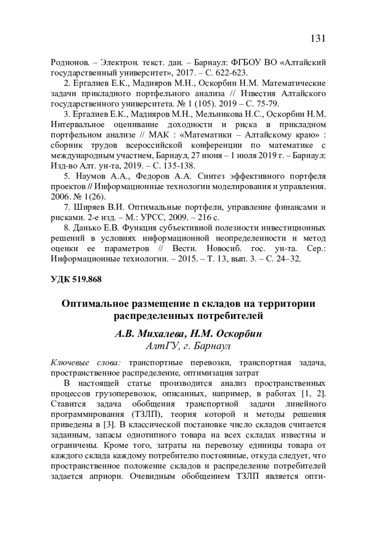 2. Ергалиев Е.К., Мадияров М.Н., Оскорбин Н.М. Математические задачи прикладного портфельного анализа // Известия Алтайского государственного университета. № 1 (105). 2019 - С. 75-79. EDN: YZEBHV