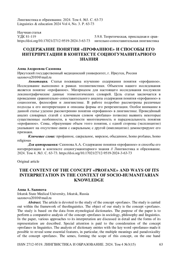 Статья посвящена изучению содержания понятия «профанное». Исследование выполнено в рамках теолингвистики. Объектом нашего исследования является понятие «профанное». Материалом для настоящего исследования послужили лексикографические данные этимологических словарей. Цель статьи заключается в проведении сравнительно-сопоставительного анализа содержания понятия «профанное» в социологии, философии и лингвистике. В работе подробно рассмотрены различные подходы к его интерпретации и описаны формы его репрезентации. Особое внимание в данной статье уделено рассмотрению понятия «профанное» в лингвистике. Проведённый анализ словарных статей с ключевым словом «profanus» позволил выявить некоторые существенные особенности, в частности многозначность и парадоксальность понятия «профанное». Семы, образующие объем этого понятия, с одной стороны (эксплицитно) указывают на отсутствие связи с сакральным; с другой (имплицитно) демонстрируют его признаки.