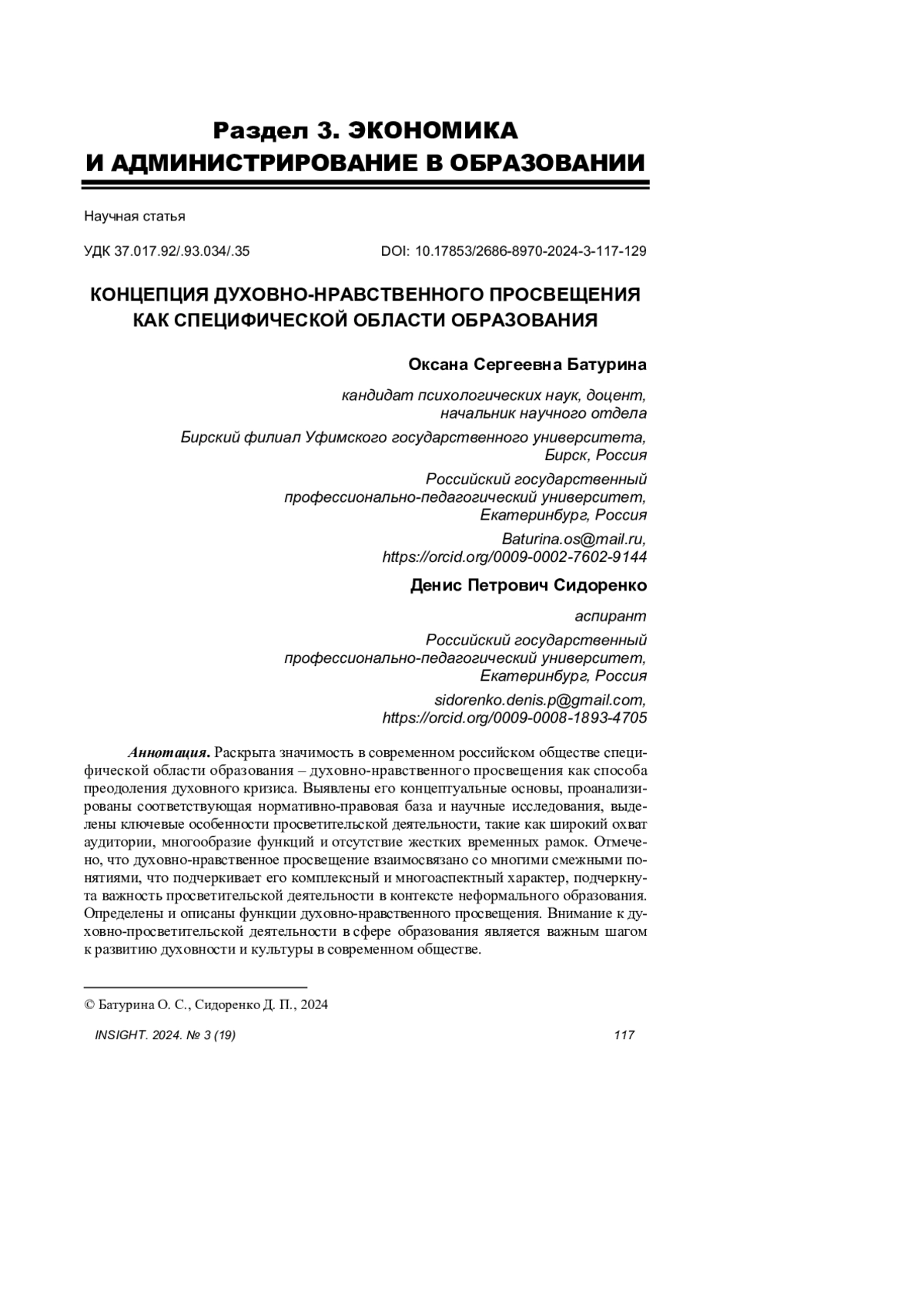 Раскрыта значимость в современном российском обществе специфической области образования - духовно-нравственного просвещения как способа преодоления духовного кризиса. Выявлены его концептуальные основы, проанализированы соответствующая нормативно-правовая база и научные исследования, выделены ключевые особенности просветительской деятельности, такие как широкий охват аудитории, многообразие функций и отсутствие жестких временных рамок. Отмечено, что духовно-нравственное просвещение взаимосвязано со многими смежными понятиями, что подчеркивает его комплексный и многоаспектный характер, подчеркнута важность просветительской деятельности в контексте неформального образования. Определены и описаны функции духовно-нравственного просвещения. Внимание к духовно-просветительской деятельности в сфере образования является важным шагом к развитию духовности и культуры в современном обществе.