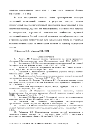 6. Алипичев А.Ю., Порческу Г.В., Сергеева Н.А. Специальная лексика в научно-популярном тексте и ее перевод // Вестник Череповецкого государственного университета. - 2023. - № 2 (113). - С. 7-19.