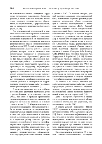 7. Богачева О.И., Иванов М.В., Марголина И.А. [и др.]. Оценка эффективности психологической образовательной программы для родителей детей с расстройствами аутистического спектра // Вестник психотерапии. 2022. № 83. С. 19-28. DOI: 10.25016/2782-652X-2022-0-83-19-28 EDN: UHCKIU