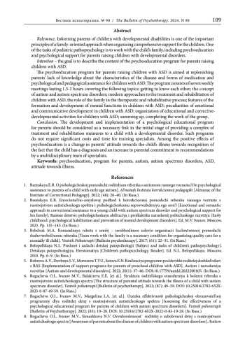 1. Баенская Е.Р. О психологической помощи родителям ребенка с аутизмом раннего возраста // Альманах Института коррекционной педагогики. 2022. № 48 (5). С. 26-40. EDN: ENSNTU
