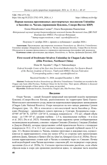 САЕНКО Е. М., НАКОНЕЧНАЯ О. В. ПЕРВАЯ НАХОДКА ПРЕСНОВОДНЫХ ДВУСТВОРЧАТЫХ МОЛЛЮСКОВ UNIONIDAE В БАССЕЙНЕ ОЗ. ЧАГАНЬ (ПРОВИНЦИЯ ЦЗИЛИНЬ, СЕВЕРО-ВОСТОК КНР) // БИОТА И СРЕДА ПРИРОДНЫХ ТЕРРИТОРИЙ. 2024. № 4, ТОМ 12