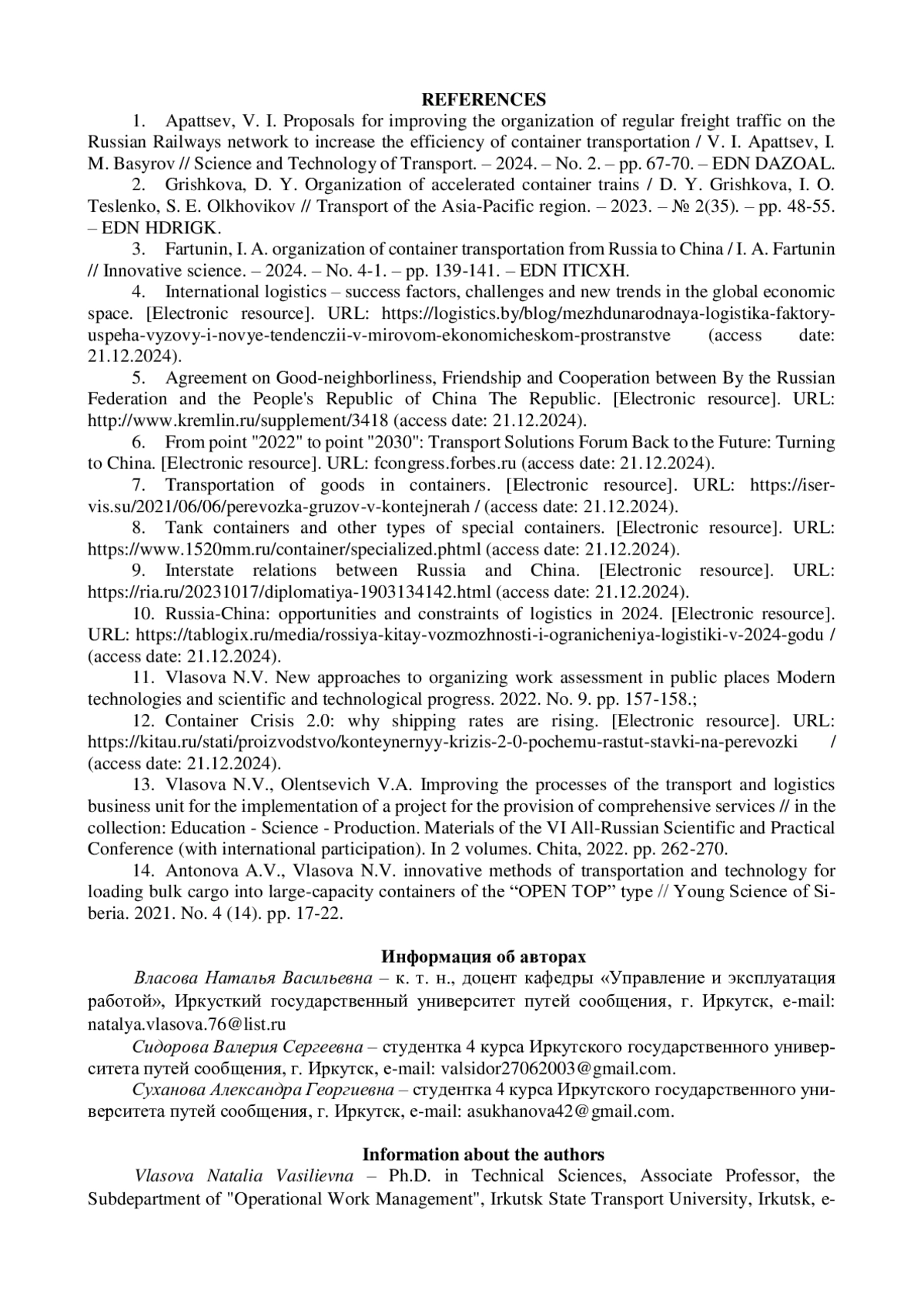 - Фартунин, И. А. организация контейнерных перевозок из России в Китай / И. А. Фартунин // Инновационная наука. – 2024. – № 4-1. – С. 139-141. – EDN ITICXH.
