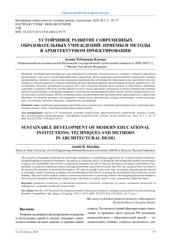 Принципы устойчивой архитектуры все чаще признаются в качестве методологического подхода к созданию современной архитектуры, в том числе зданий образовательных учреждений. Целью написания статьи является определение основных архитектурных методов и приемов для повышения характеристик устойчивости образовательных учреждений. Для объективного описания приемов и методов устойчивости были проанализированы архитектурные решения зарубежных и отечественных объектов, построенных не раньше 2015 года, концепция которых была основана на стремлении к принципам устойчивого развития. Изучение научных трудов по теме, анализ проектных материалов позволили выявить ряд методов, приемов и рекомендаций, позволяющих развивать устойчивость архитектуры подобных зданий. Данная статья будет полезна студентам архитектурных ВУЗов или практикующим архитекторам при проектировании образовательных учреждений. Подобные исследования призваны стимулировать создание таких пространств, которые вдохновляют, чтобы анализировать, исследовать, творить, общаться, сотрудничать, размышлять