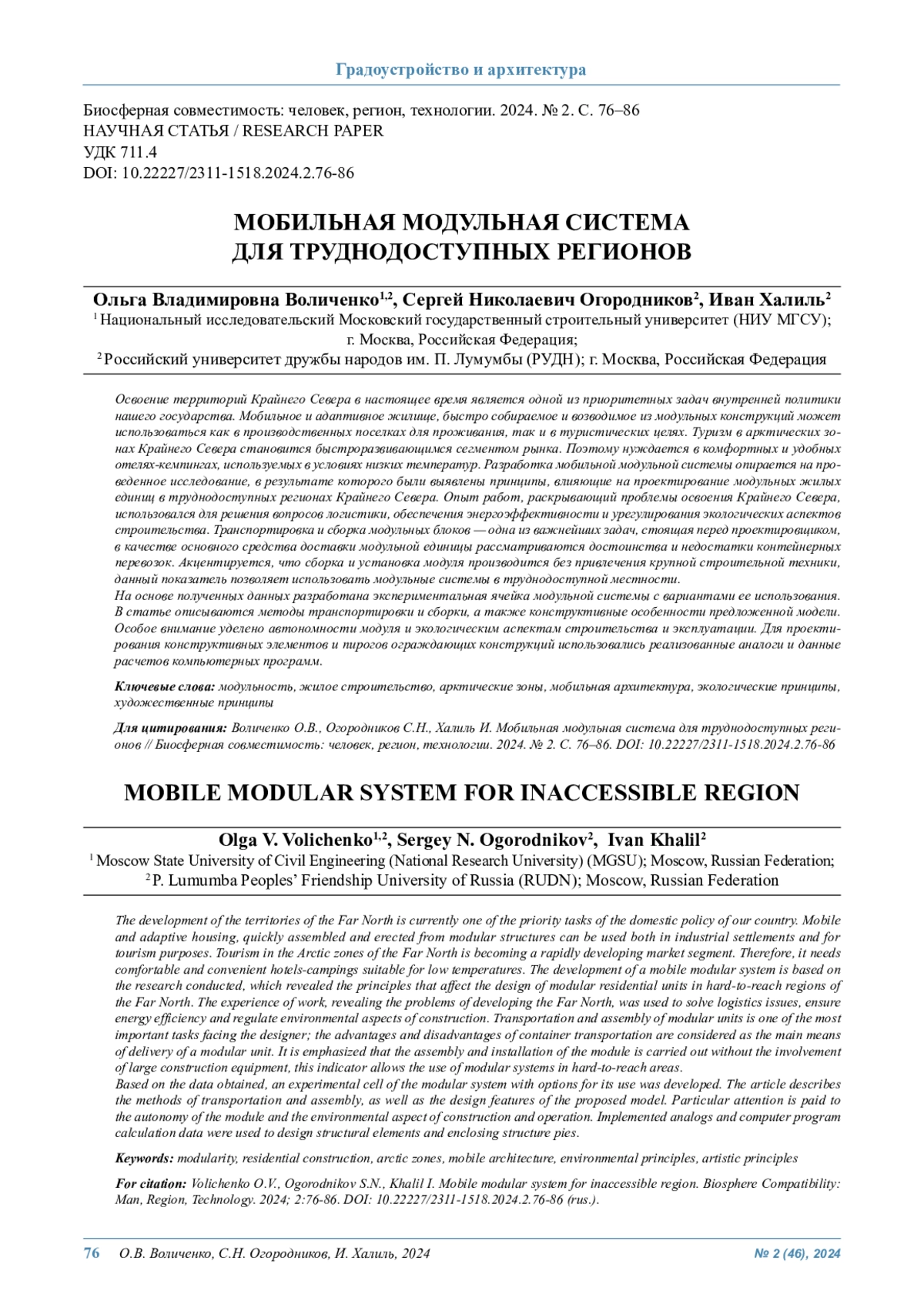 Освоение территорий Крайнего Севера в настоящее время является одной из приоритетных задач внутренней политики нашего государства. Мобильное и адаптивное жилище, быстро собираемое и возводимое из модульных конструкций может использоваться как в производственных поселках для проживания, так и в туристических целях. Туризм в арктических зонах Крайнего Севера становится быстроразвивающимся сегментом рынка. Поэтому нуждается в комфортных и удобных отелях-кемпингах, используемых в условиях низких температур. Разработка мобильной модульной системы опирается на проведенное исследование, в результате которого были выявлены принципы, влияющие на проектирование модульных жилых единиц в труднодоступных регионах Крайнего Севера. Опыт работ, раскрывающий проблемы освоения Крайнего Севера, использовался для решения вопросов логистики, обеспечения энергоэффективности и урегулирования экологических аспектов строительства. Транспортировка и сборка модульных блоков — одна из важнейших задач, стоящая перед проектировщиком, в качестве основного средства доставки модульной единицы рассматриваются достоинства и недостатки контейнерных перевозок. Акцентируется, что сборка и установка модуля производится без привлечения крупной строительной техники, данный показатель позволяет использовать модульные системы в труднодоступной местности.