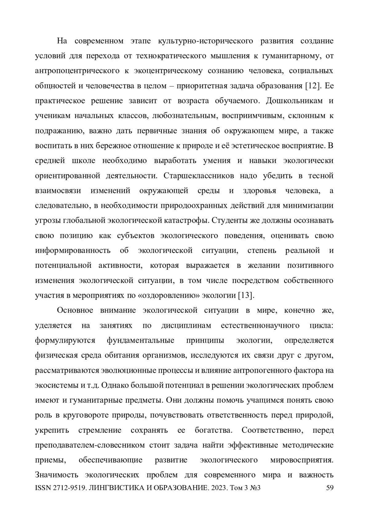 Значительные антропогенные изменения в окружающей среде обострили противоречия между человеком и природой и обусловили актуальность перехода к экоцентрическому сознанию. В связи с этим возникла необходимость экологизации учебного процесса на всех ступенях образования. Системное введение экологического компонента в практику преподавания русского языка на этапе довузовской подготовки помогает учащимся понять свою роль в круговороте природы, почувствовать ответственность перед природой, укрепить стремление сохранять ее богатства. Для реализации поставленной задачи эффективно регулярное проведение экологических минуток в разной форме (словарный диктант экологической направленности, анализ аналогичных предложений или текстов, поиск речевых ошибок и их исправление в заданном тексте). Для формирования устойчивых знаний по экологической тематике и повышения результативности образовательного процесса полезны игровые задания. Представленный в статье опыт использования различных методических приемов позволяет усилить экологические аспекты на занятиях по русскому языку и дает возможность привлечь внимание обучаемых к экологическим проблемам.