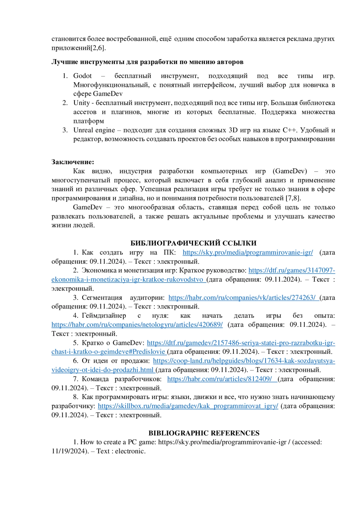 - Кратко о GameDev: https://dtf.ru/gamedev/2157486-seriya-statei-pro-razrabotku-igr-chast-i-kratko-o-geimdeve#Predislovie (дата обращения: 09.11.2024). – Текст : электронный.