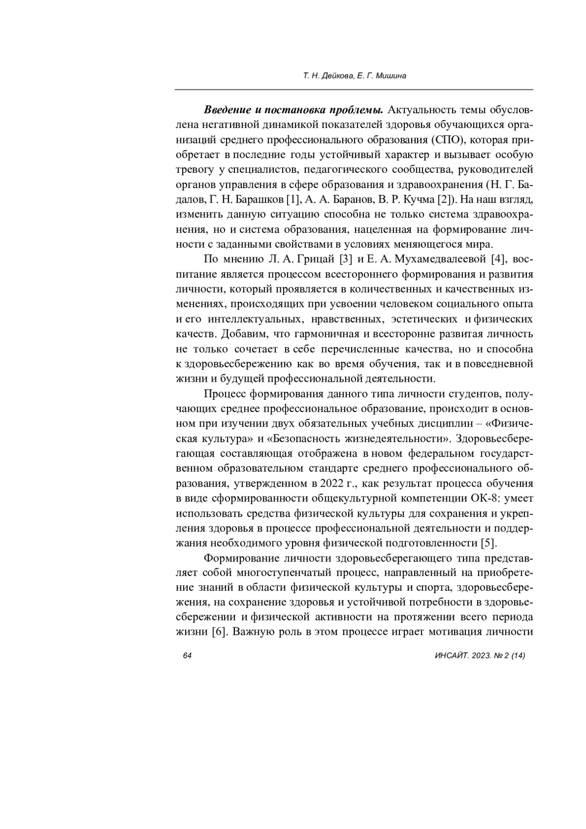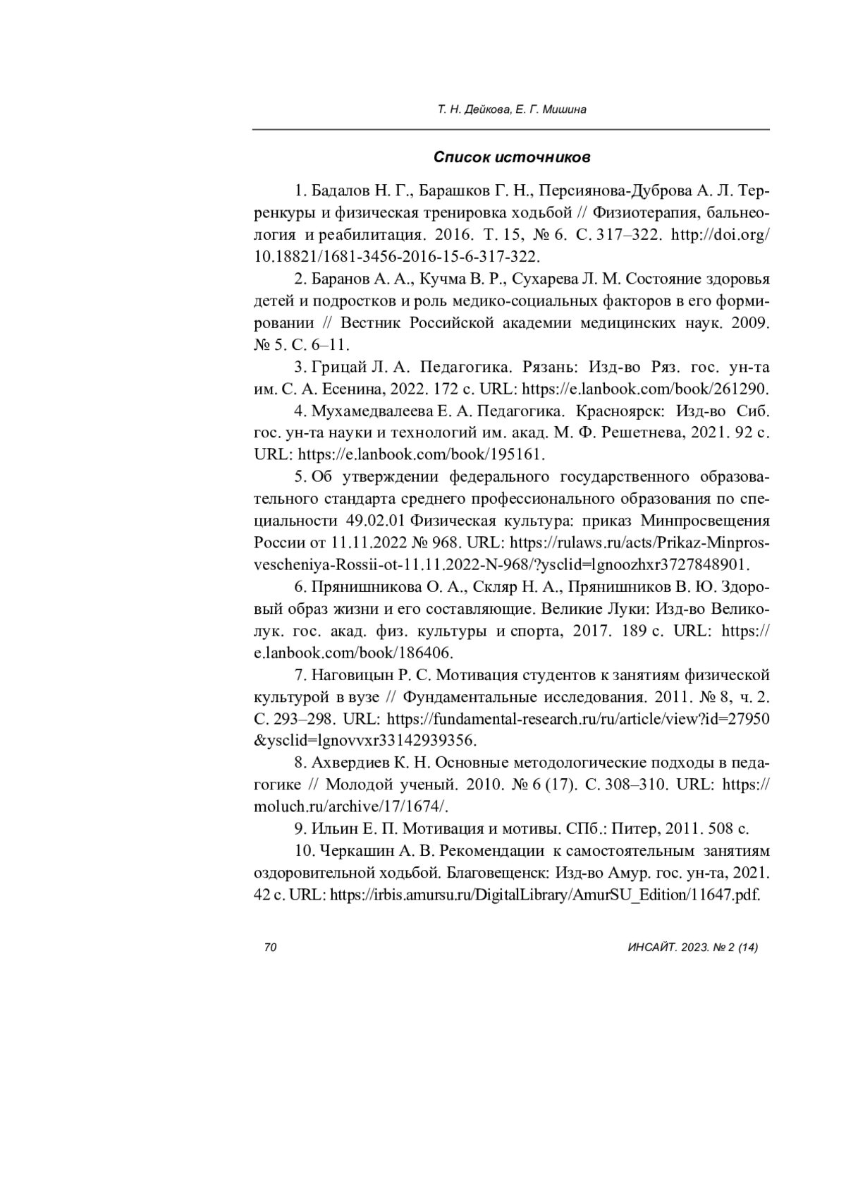 13. Дейкова Т. Н., Мишина Е. Г. Образовательный терренкур как средство формирования положительной мотивации у студентов специальной медицинской группы к занятиям физической культурой // Глобальный научный потенциал. 2020. № 8 (113). С. 31-34. URL: http://globaljournals.ru/assets/files/journals/global-scientific-potential/113/ g-n-p-8(113)-main.pdf?ysclid=lgnpjgml21845189813. EDN: JJZFGD