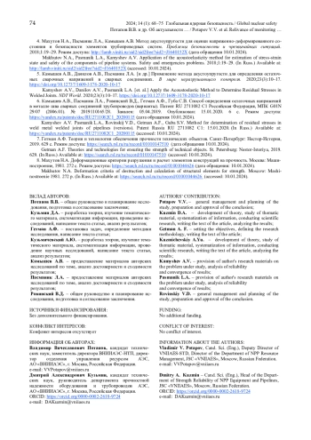 4. Махутов Н.А., Пасманик Л.А., Камышев А.В. Метод акустоупругости для оценки напряженно-деформированного состояния и безопасности элементов трубопроводных систем. Проблемы безопасности и чрезвычайных ситуаций. 2018;1:19-29. Режим доступа: http://lamb.viniti.ru/sid2/sid2free?sid2=J1640152X (дата обращения 10.01.2024).