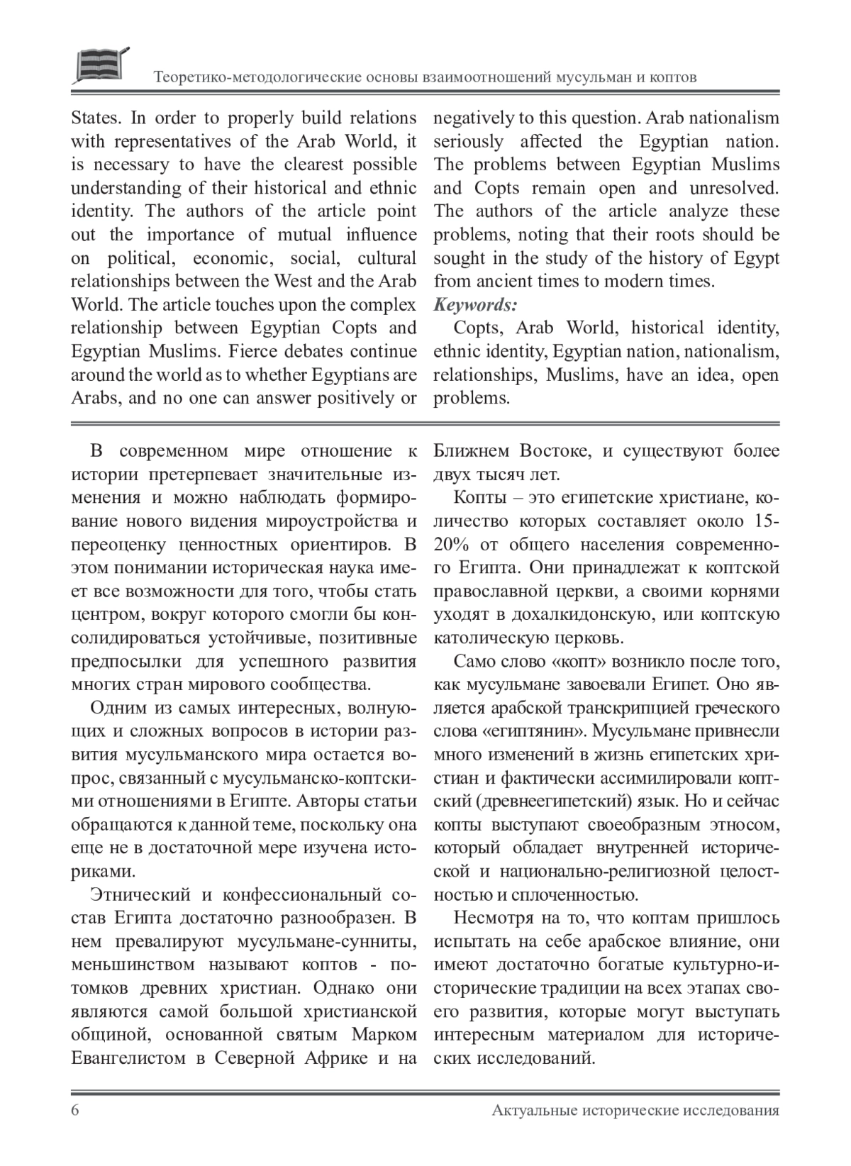 В данной статье авторы рассматривают один из самых сложных вопросов, который является актуальным в настоящее время: исторически сложившиеся взаимоотношения мусульман и коптов в Египте. Кроме того, значительная часть коптских христиан проживает в других африканских странах, в Европе и США. Чтобы правильно выстраивать отношения с представителями стран арабского мира, необходимо иметь максимально четкое представление об их исторической и этнической идентичности. Авторы статьи отмечают важность взаимного влияния на политические, экономические, социальные, культурные отношения между Западом и арабским Востоком. В статье затрагиваются сложные отношения между египетскими коптами и египетскими мусульманами. По всему миру продолжаются ожесточенные споры, являются ли египтяне арабами, и никто не может ответить ни положительно, ни отрицательно на данный вопрос. Арабский национализм серьезно повлиял на египетскую нацию. Проблемы между египетскими мусульманами и коптами остаются открытыми и нерешенными. Авторы статьи дают анализ этим проблемам, отмечая, что их корни следует искать в изучении истории Египта с древнейших времен до новейшего времени.