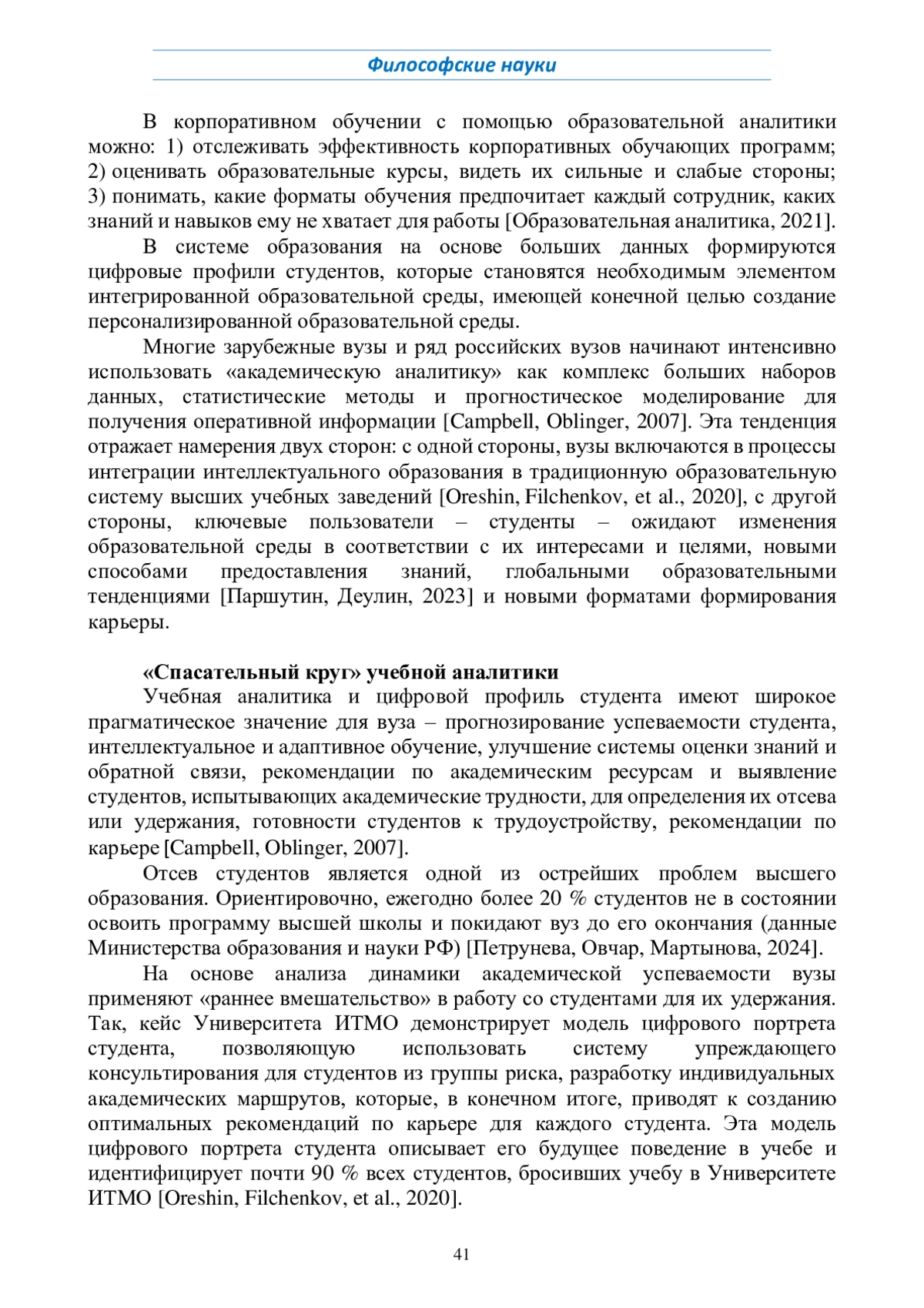 18. Oreshin S.A., Filchenkov A.A., Kozlova D.K., Petrusha P.G., Lisitsyna L.S., Panfilov A.N., Glukhov I.A., Krasheninnikov E.I., Buraya K.I. (2020) The Use of Students’ Digital Portraits in Creating Smart Higher Education: A Case Study of the AI Benefits in Analyzing Educational and Social Media Data. Smart Education and e-Learning.Computer Science, Education. Vol. 188. Р. 233-243.