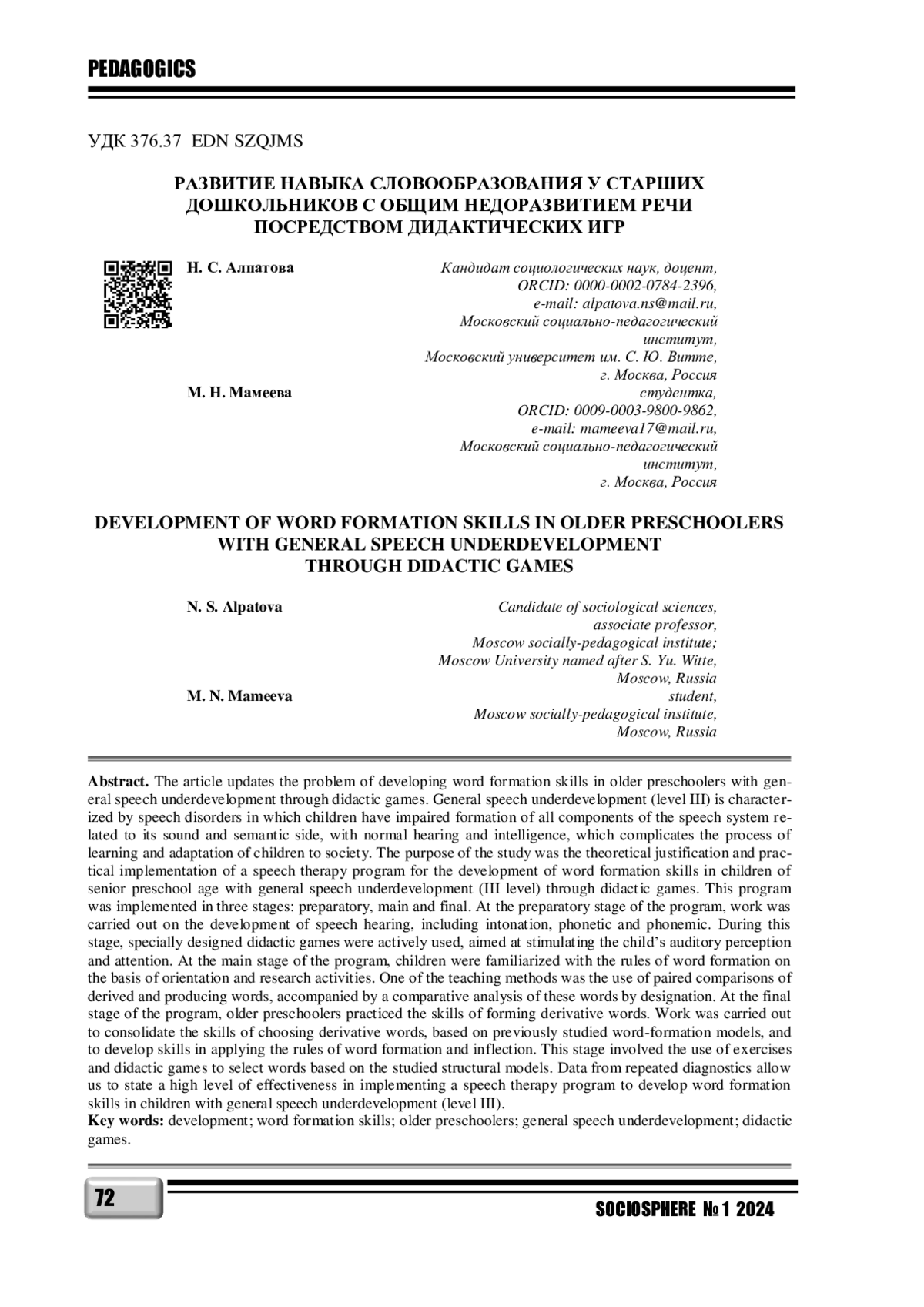 Ключевые фразы: развитие, навыки словообразования, старшие дошкольники, общее недоразвитие речи, дидактические игры, development, word formation skills, older preschoolers, general speech underdevelopment, didactic games