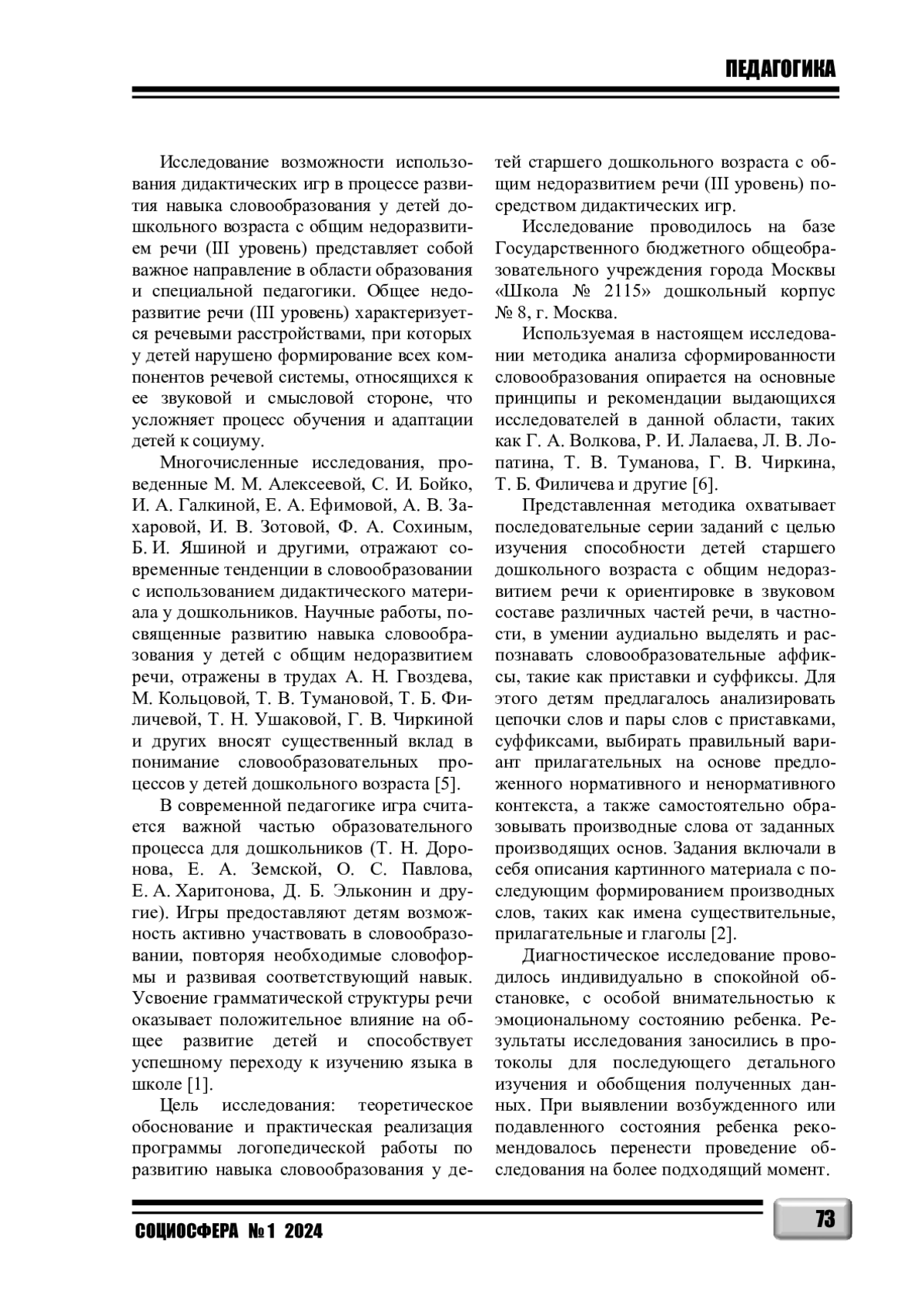 Статья: РАЗВИТИЕ НАВЫКА СЛОВООБРАЗОВАНИЯ У СТАРШИХ ДОШКОЛЬНИКОВ С ОБЩИМ НЕДОРАЗВИТИЕМ РЕЧИ ПОСРЕДСТВОМ ДИДАКТИЧЕСКИХ ИГР (2024)