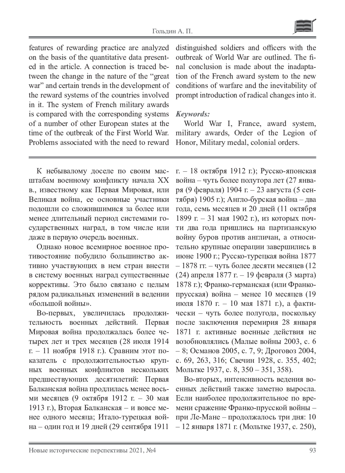 2. Гольдин 2019 – Гольдин А.П. Система военных наград и некоторые особенности наградной практики Французской республики (1870 – 1914 гг.) // Новые исторические перспективы, 2019, № 2 (15), с. 19 - 29.