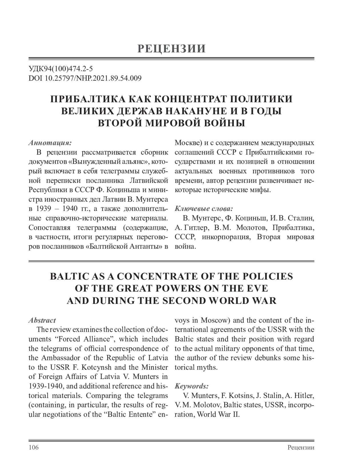 В рецензии рассматривается сборник документов «Вынужденный альянс», который включает в себя телеграммы служебной переписки посланника Латвийской Республики в СССР Ф. Коциньша и министра иностранных дел Латвии В. Мунтерса в 1939 – 1940 гг., а также дополнительные справочно-исторические материалы. Сопоставляя телеграммы (содержащие, в частности, итоги регулярных переговоров посланников «Балтийской Антанты» в Москве) и с содержанием международных соглашений СССР с Прибалтийскими государствами и их позицией в отношении актуальных военных противников того времени, автор рецензии развенчивает некоторые исторические мифы.