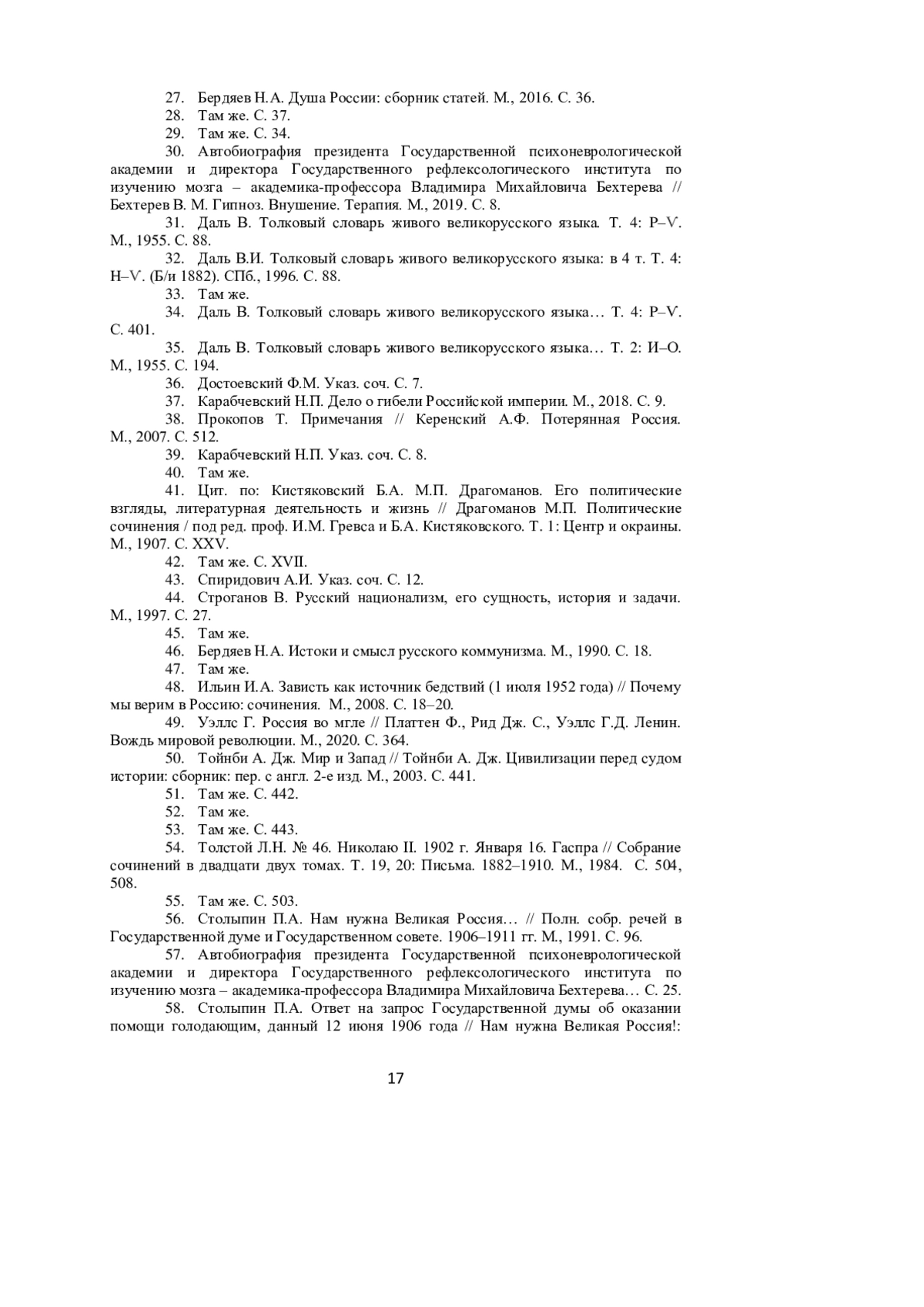 30. Автобиография президента Государственной психоневрологической академии и директора Государственного рефлексологического института по изучению мозга – академика-профессора Владимира Михайловича Бехтерева // Бехтерев В. М. Гипноз. Внушение. Терапия. М., 2019. С. 8. 31. Даль В. Толковый словарь живого великорусского языка. Т. 4: P–Ѵ. М., 1955. С. 88.