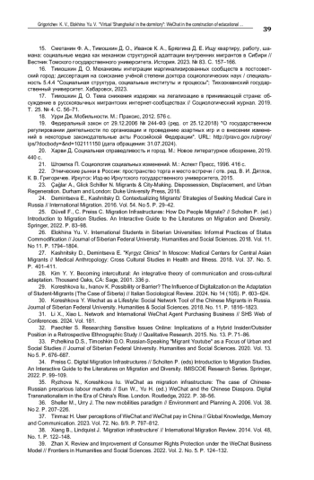 15. Сметанин Ф. А., Тимошкин Д. О., Иванов К. А., Брязгина Д. Е. Ищу квартиру, работу, шамана: социальные медиа как механизм структурной адаптации внутренних мигрантов в Сибири // Вестник Томского государственного университета. История. 2023. № 83. С. 157-166. EDN: HEPTBJ