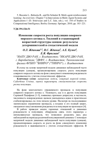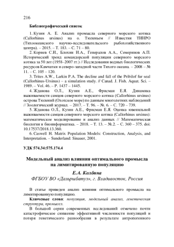 5. Жданова О.Л., Кузин А.Е., Фрисман Е.Я. Оценка ювенильной выживаемости самцов северного морского котика (Сallorhinus ursinus): математическое моделирование и анализ данных // Математическая биология и биоинформатика. - 2018. - Т. 13. - №.2. - С. 360 - 375. DOI: 10.17537/2018.13.360 EDN: YTUUPZ