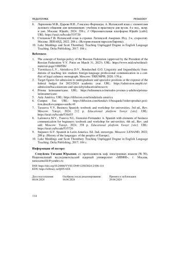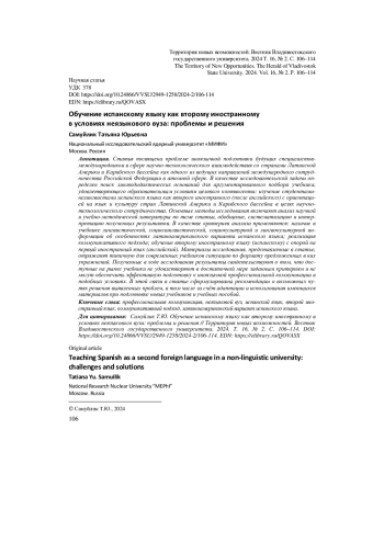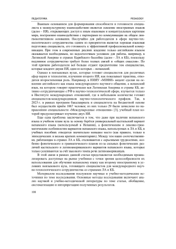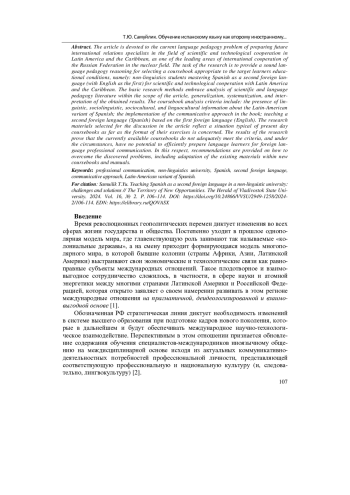 Статья посвящена проблеме иноязычной подготовки будущих специалистов-международников в сфере научно-технологического взаимодействия со странами Латинской Америки и Карибского бассейна как одного из ведущих направлений международного сотрудничества Российской Федерации в атомной сфере. В качестве исследовательской задачи определен поиск лингводидактических оснований для аргументированного подбора учебника, удовлетворяющего образовательным условиям целевого контингента: изучение студентами-нелингвистами испанского языка как второго иностранного (после английского) с ориентацией на язык и культуру стран Латинской Америки и Карибского бассейна в целях научно-технологического сотрудничества. Основные методы исследования включают анализ научной и учебно-методической литературы по теме статьи, обобщение, систематизацию и интерпретацию полученных результатов. В качестве критериев анализа применяются: наличие в учебнике лингвистической, социолингвистической, социокультурной и лингвокультурной информации об особенностях латиноамериканского варианта испанского языка; реализация коммуникативного подхода; обучение второму иностранному языку (испанскому) с опорой на первый иностранный язык (английский). Материалы исследования, представленные в статье, отражают типичную для современных учебников ситуацию по формату предложенных в них упражнений. Полученные в ходе исследования результаты свидетельствуют о том, что доступные на рынке учебники не удовлетворяют в достаточной мере заданным критериям и не могут обеспечить эффективную подготовку к иноязычной профессиональной коммуникации в подобных условиях. В этой связи в статье сформулированы рекомендации о возможных путях решения выявленных проблем, в том числе за счёт адаптации и использования имеющихся материалов при подготовке новых учебников и учебных пособий.