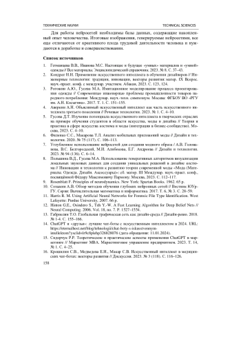 2. Кондрат Н.Н. Применение искусственного интеллекта в обучении дизайнеров // Инженерные технологии: традиции, инновации, векторы развития: матер. IХ Всерос. науч.-практ. конф. с междунар. участием. Абакан, 2023. С. 123, 124. EDN: VLTRXK