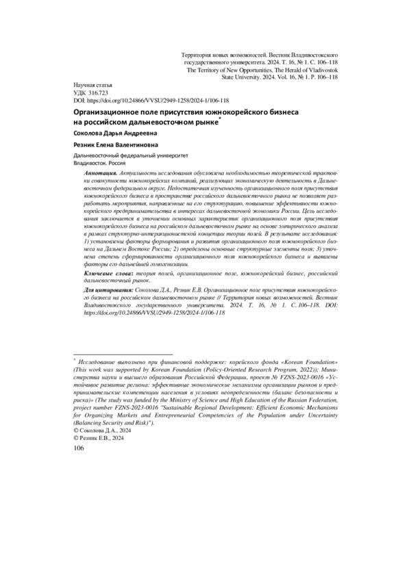 Актуальность исследования обусловлена необходимостью теоретической трактовки совокупности южнокорейских компаний, реализующих экономическую деятельность в Дальневосточном федеральном округе. Недостаточная изученность организационного поля присутствия южнокорейского бизнеса в пространстве российского дальневосточного рынка не позволяет разработать мероприятия, направленные на его структурацию, повышение эффективности южнокорейского предпринимательства в интересах дальневосточной экономики России. Цель исследования заключается в уточнении основных характеристик организационного поля присутствия южнокорейского бизнеса на российском дальневосточном рынке на основе эмпирического анализа в рамках структурно-интеракционистской концепции теории полей. В результате исследования: 1) установлены факторы формирования и развития организационного поля южнокорейского бизнеса на Дальнем Востоке России; 2) определены основные структурные элементы поля; 3) уточнена степень сформированности организационного поля южнокорейского бизнеса и выявлены факторы его дальнейшей гомогенизации.