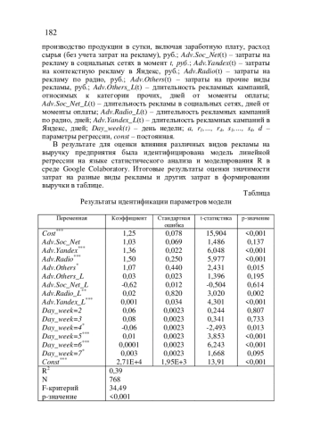 В работе представлены результаты применения методов регрессионного анализа к оценке экономической эффективности рекламы различного вида на примере предприятия общественного питания. В работе использованы данные по суточным продажам и затратам за период 2019-2022 гг. Результаты подтвердили наличие положительного эффекта рекламы, значимо, влияющую на выручку предприятия.