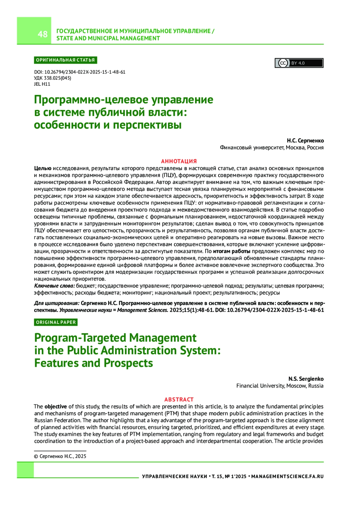 Целью исследования, результаты которого представлены в настоящей статье, стал анализ основных принципов и механизмов программно-целевого управления (ПЦУ), формирующих современную практику государственного администрирования в Российской Федерации. Автор акцентирует внимание на том, что важным ключевым преимуществом программно-целевого метода выступает тесная увязка планируемых мероприятий с финансовыми ресурсами; при этом на каждом этапе обеспечивается адресность, приоритетность и эффективность затрат. В ходе работы рассмотрены ключевые особенности применения ПЦУ: от нормативно-правовой регламентации и согласования бюджета до внедрения проектного подхода и межведомственного взаимодействия. В статье подробно освещены типичные проблемы, связанные с формальным планированием, недостаточной координацией между уровнями власти и затрудненным мониторингом результатов; сделан вывод о том, что совокупность принципов ПЦУ обеспечивает его целостность, прозрачность и результативность, позволяя органам публичной власти достигать поставленных социально-экономических целей и оперативно реагировать на новые вызовы. Важное место в процессе исследования было уделено перспективам совершенствования, которые включают усиление цифровизации, прозрачности и ответственности за достигнутые показатели. По итогам работы предложен комплекс мер по повышению эффективности программно-целевого управления, предполагающий обновленные стандарты планирования, формирование единой цифровой платформы и более активное вовлечение экспертного сообщества. Это может служить ориентиром для модернизации государственных программ и успешной реализации долгосрочных национальных приоритетов.