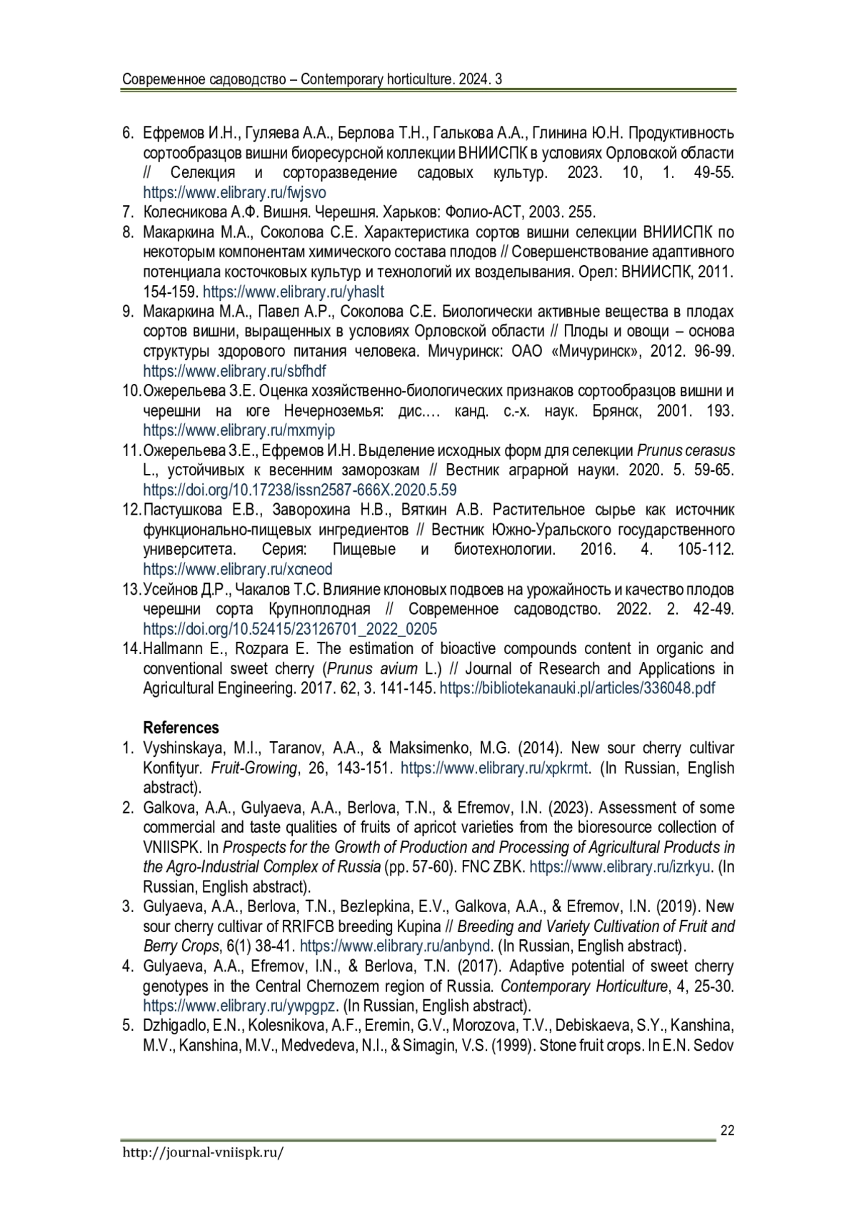 В статье приводится подробное описание нового сорта вишни обыкновенной, созданного на базе Всероссийского научно-исследовательского института селекции плодовых культур (ВНИИСПК). Этот сорт, получивший название Наставница, был выведен в лаборатории селекции и сортоизучения косточковых культур. Авторами сорта являются Гуляева Александра Алексеевна, Джигадло Елизавета Николаевна, Колесникова Аделина Фроловна, Макаркина Маргарита Алексеевна и Ефремов Игорь Николаевич. Сорт Наставница был получен в 1984 году путём целенаправленного искусственного скрещивания двух сортов вишни обыкновенной – Антрацитовая и Превосходная Веньяминова. В 1990 году отмечено начало плодоношения сорта, а в 1998 году он был выделен в категорию элитных сеянцев. Станционные испытания нового сортообразца проводились с 2013 по 2023 годы в садах отдела селекции и сортоизучения косточковых культур ВНИИСПК. Растения были высажены по стандартной для нашего региона схеме для вишни – 5,0 × 3,0 метра. В качестве подвоя использовался клоновый подвой вишни В-2-180, созданный во ВНИИСПК. В ходе изучения сорта применялась стандартная система мероприятий по защите растений от повреждений болезнями (коккомикозом и монилиозом) и вредителями. Изучение основных хозяйственно-биологических показателей проводилось в соответствии с основными методическими рекомендациями. Технологическая и биохимическая оценка плодов сорта Наставница была проведена в лаборатории технологической и биохимической оценки сортов и хранения ВНИИСПК. Данный сорт является перспективным для возделывания в Центрально-Чернозёмном регионе России и может быть рекомендован как для промышленного возделывания, так и для использования в дальнейших селекционных исследованиях на комплекс хозяйственно-ценных признаков.